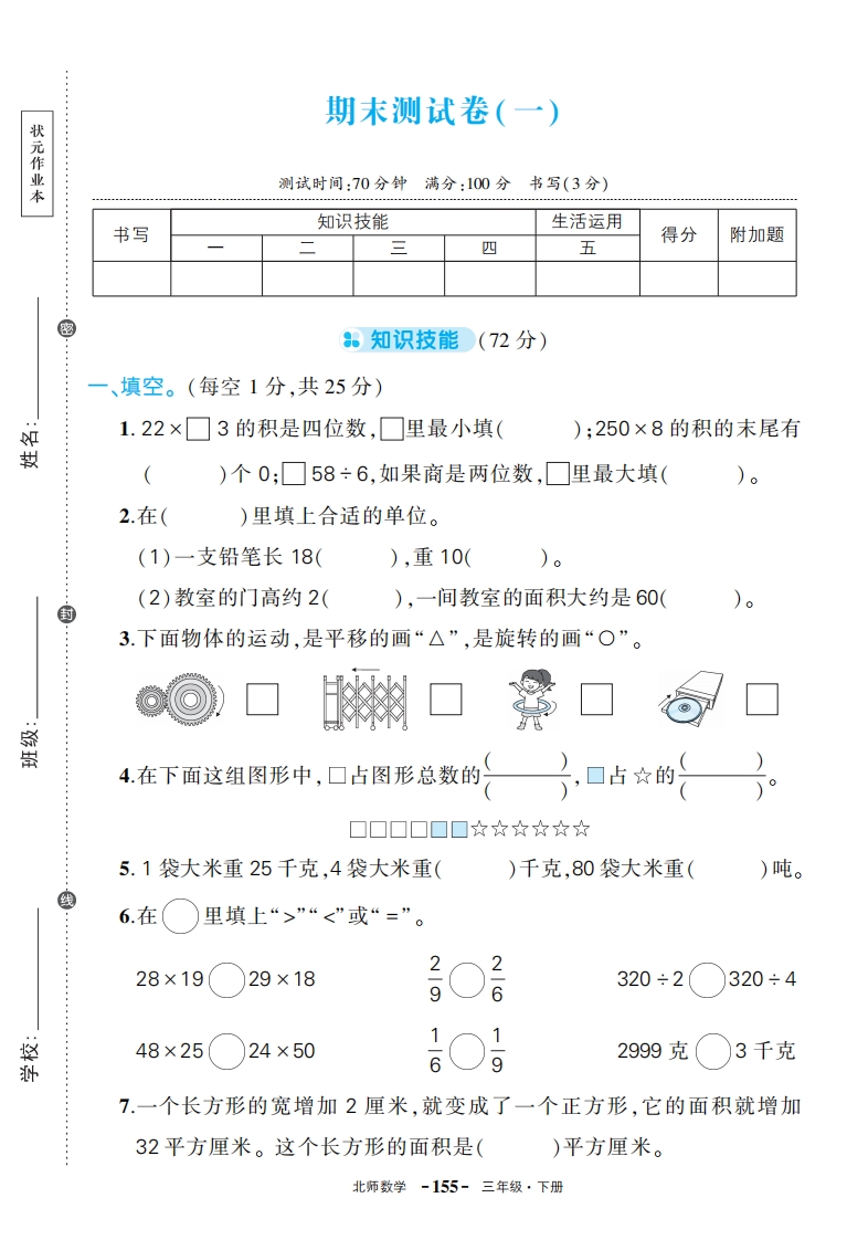 学生啦:期末测试卷(一)状元作业测试时间:70分钟满分:100分书写(3分)知识技能生活运用书写附加题三四五得分。知识技能(72分)一、填空。(每空1分,共25分)1.22×☐3的积是四位数,☐里最小填();250×8的积的末尾有()个0;☐58÷6,如果商是两位数,☐里最大填(2.在()里填上合适的单位。(1)一支铅笔长18(),重10((2)教室的门高约2(),一间教室的面积大约是60(3.下面物体的运动,是平移的画“△”,是旋转的画“O”。蜜4.在下面这组图形中,口占图形总数的,口占☆的5.1袋大米重25千克,4袋大米重()千克,80袋大米重()吨。线6.在里填上“>”“<”或“=”。28×1929×18292-6320÷2320÷448×2524×5062999克3千克7.一个长方形的宽增加2厘米,就变成了一个正方形,它的面积就增加32平方厘米。这个长方形的面积是()平方厘米。北师数学-155-三年级·下册