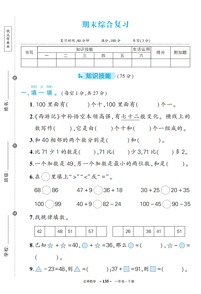 学生啦:期末综合复习状元作业复习时间:80分钟满分:100分书写(3分)知识技能生活运用书写得分附加题二四五六8知识技能(75分)tian yi tian填一填。(每空1分,共27分)1.100里面有()个十,100里面有(拟2.《西游记》中孙悟空本领高强,有七十二般变化。横线上的数写作(),它是由()个十和()个一组成的。3.和40相邻的两个数分别是()和(4.比71少1的数是(),71比()少3,71比()多2。5.一个加数是49,另一个加数是最小的两位数,和是()。6.在里填上“>”“<”或“=”。688647+936+1830+2520+351009940+982-24100-4590-357.找规律填数。42485157263641518.已知☆+☆=40,○+☆=36,那么○=(),☆-○=9.△-23=48,则△=();37+☐=91,则☐=(北师数学-135-一年级·下册
