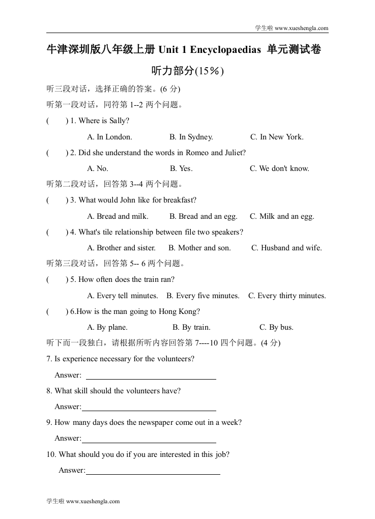 学生啦:学生啦www.xueshengla.com牛津深圳版八年级上册Unit1 Encyclopaedias单元测试卷听力部分(15%)听三段对话,选择正确的答案。(6分)听第一段对话,同符第1-2两个问题。()1.Where is Sally?A.In London.B.In Sydney.C.In New York.()2.Did she understand the words in Romeo and Juliet?A.No.B.Yes.C.We don't know.听第二段对话,回答第3-4两个问题。()3.What would John like for breakfast?A.Bread and milk.B.Bread and an egg.C.Milk and an egg.()4.What's tile relationship between file two speakers?A.Brother and sister.B.Mother and son.C.Husband and wife.听第三段对话,回答第5-6两个问题。()5.How often does the train ran?A.Every tell minutes.B.Every five minutes.C.Every thirty minutes.()6.How is the man going to Hong Kong?A.By plane.B.By train.C.By bus.听下而一段独白,请根据所听内容回答第7--10四个问题。(4分)7.Is experience necessary for the volunteers?Answer:8.What skill should the volunteers have?Answer:9.How many days does the newspaper come out in a week?Answer:10.What should you do if you are interested in this job?Answer:学生啦www.xueshengla.com