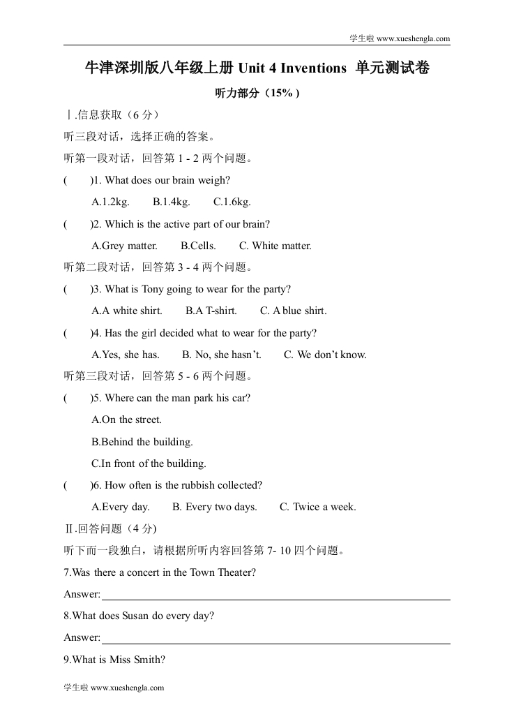 学生啦:学生啦www.xueshengla.com牛津深圳版八年级上册Unit4 Inventions单元测试卷听力部分(15%)听三段对话,选择正确的答案。听第一段对话,回答第1-2两个问题。)1.What does our brain weigh?A.1.2kg.B.1.4kg.C.1.6kg)2.Which is the active part of our brain?A.Grey matter.B.Cells.C.White matter.听第二段对话,回答第3·4两个问题。()3.What is Tony going to wear for the party?A.A white shirt.B.A T-shirt.C.A blue shirt)4.Has the girl decided what to wear for the party?A.Yes,she has.B.No,she hasn't.C.We don't know.听第三段对话,回答第5-6两个问题。()5.Where can the man park his car?A.On the street.B.Behind the building.C.In front of the building.)6.How often is the rubbish collected?A.Every day.B.Every two days.C.Twice a week.Ⅱ.回答问题(4分)听下而一段独白,请根据所听内容回答第7-10四个问题。7.Was there a concert in the Town Theater?Answer:8.What does Susan do every day?Answer:9.What is Miss Smith?学生啦www.xueshengla.corm