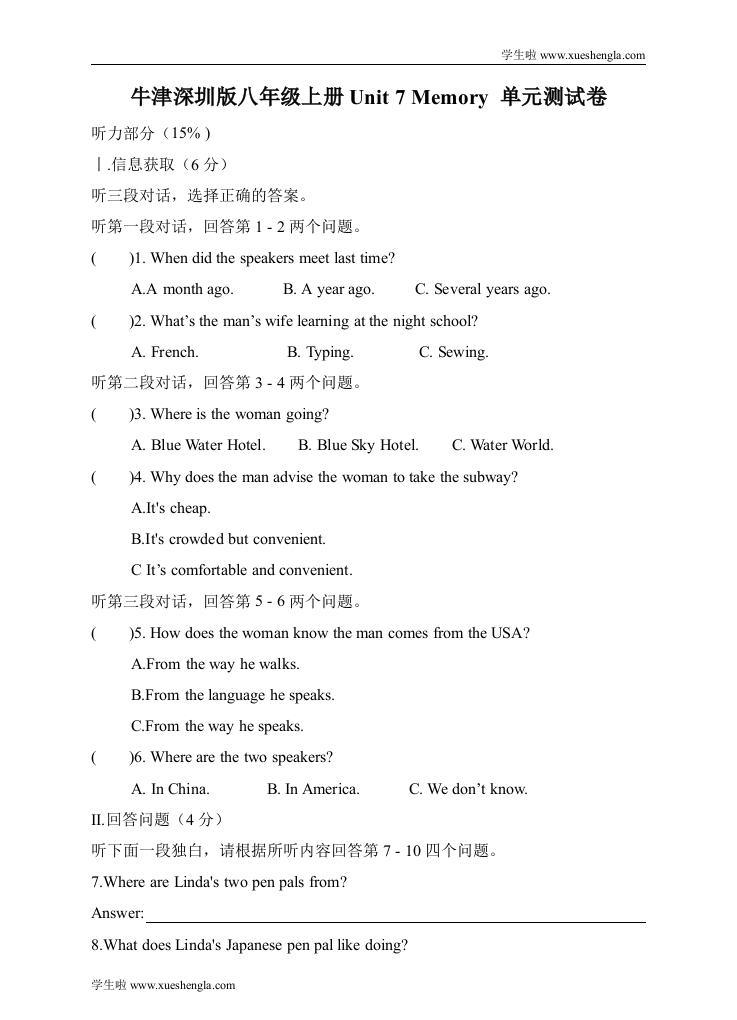 学生啦:学生啦www.xueshengla.com牛津深圳版八年级上册Unit7 Memory单元测试卷听力部分(15%)听三段对话,选择正确的答案。听第一段对话,回答第1-2两个问题。)1.When did the speakers meet last time?A.A month ago.B.A year ago.C.Several years ago.)2.What's the man's wife learning at the night school?A.French.B.Typing.C.Sewing.听第二段对话,回答第3·4两个问题。()3.Where is the woman going?A.Blue Water Hotel.B.Blue Sky Hotel.C.Water World.)4.Why does the man advise the woman to take the subway?A.It's cheap.B.It's crowded but convenient.C It's comfortable and convenient.听第三段对话,回答第5-6两个问题。()5.How does the woman know the man comes from the USA?A.From the way he walks.B.From the language he speaksC.From the way he speaks)6.Where are the two speakers?A.In China.B.In America.C.We don't know.Ⅱ.回答问题(4分)听下面一段独白,请根据所听内容回答第7-10四个问题。7.Where are Linda's two pen pals from?Answer:8.What does Linda's Japanese pen pal like doing?学生啦www.xueshengla.com
