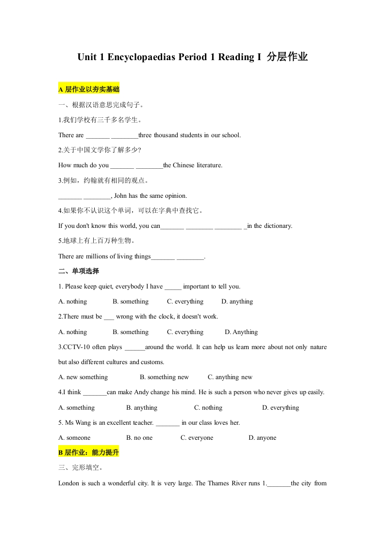 学生啦:Unit1 Encyclopaedias Period1 Reading I分层作业A层作业以夯实基础一、根据汉语意思完成句子。1.我们学校有三千多名学生。There arethree thousand students in our school.2.关于中国文学你了解多少?How much do youthe Chinese literature.3.例如,约翰就有相同的观点。John has the same opinion4.如果你不认识这个单词,可以在字典中查找它。If you don't know this world,you can.in the dictionary.5地球上有上百万种生物。There are millions of living things二、单项选择1.Please keep quiet,everybody I haveimportant to tell youA.nothingB.somethingC.everythingD.anything2.There must be wrong with the clock,it doesn't work.A.nothingB.somethingC.everythingD.Anything3.CCTV-10 often playsaround the world.It can help us leam more about not only naturebut also different cultures and customs.A.new somethingB.something newC.anything new4.I thinkcan make Andy change his mind.He is such a person who never gives up easily.A.somethingB.anythingC.nothingD.everything5.Ms Wang is an excellent teacher.in our class loves her.A.someoneB.no oneC.everyoneD.anyoneB层作业:能力提升三、完形填空London is such a wonderful city.It is very large.The Thames River runs 1.the city from
