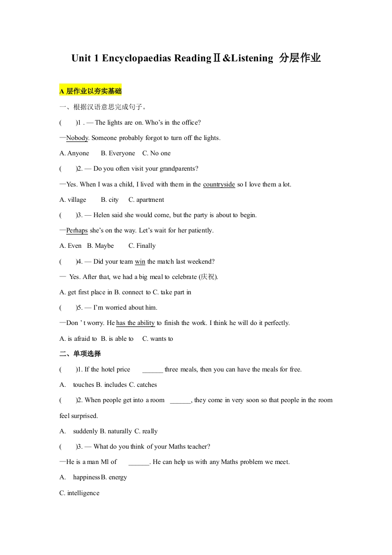 学生啦:Unit1 Encyclopaedias ReadingⅡ&Listening分层作业A层作业以夯实基础一、根据汉语意思完成句子。()1.-The lights are on.Who's in the office?-Nobody.Someone probably forgot to turn off the lights.A.Anyone B.Everyone C.No one()2.一Do you often visit your grandparents?-Yes.When I was a child,I lived with them in the countryside so I love them a lot.A.village B.city C.apartment()3.-Helen said she would come,but the party is about to begin.-Perhaps she's on the way.Let's wait for her patiently.A.Even B.Maybe C.Finally(4.一Did your team win the match last weekend?一Yes.After that,we had a big meal to celebrate(庆祝).A.get first place in B.connect to C.take part in()5.-I'm worried about him.-Don't worry.He has the ability to finish the work.I think he will do it perfectly.A.is afraid to B.is able to C.wants to二、单项选择()1.If the hotel pricethree meals,then you can have the meals for free.A.touches B.includes C.catches)2.When people get into a roomthey come in very soon so that people in the roomfeel surprised.A.suddenly B.naturally C.really()3.-What do you think of your Maths teacher?-He is a man Ml ofHe can help us with any Maths problem we meet.A.happiness B.energyC.intelligence