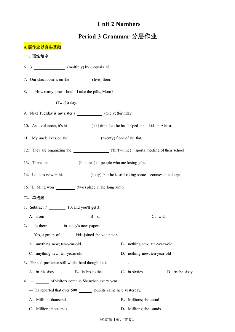 学生啦:Unit 2 NumbersPeriod3 Grammar分层作业A层作业以夯实基础一、语法填空6.3(multiply)by 6 equals 18.7.Our classroom is on the(five)floor.8.一How many times should I take the pills,Mom?(Two)a day9.Next Tuesday is my sister's(twelve )birthday.10.As a volunteer,it's his(six)time that he has helped the kids in Africa.11.My uncle lives on the(twenty)floor of the flat.12.They are organizing the(thirty-nine)sports meeting of their school.13.There are(hundred)of people who are losing jobs.14.Louis is now in his(sixty),but he is still taking some courses at college.15.Li Ming won(two)place in the long jump.二、单选题1.Subtract 710,and you'll get 3.A.fromB.ofC.with2.-Is therein today's newspaper?一Yes,a group ofkids joined the volunteers.A.anything new;ten-year-oldB.nothing new;ten-years-oldC.anything new;ten-years-oldD.nothing new;ten-year-old3.The old professor still works hard though he isA.in his sixtyB.in his sixtiesC.in sixtiesD.in the sixtyof visitors come to Shenzhen every year.-It's reported that over 500tourists came here yesterday.A.Million:thousandB.Millions:thousandC.Million:thousandsD.Millions:thousands试卷第1页,共8页
