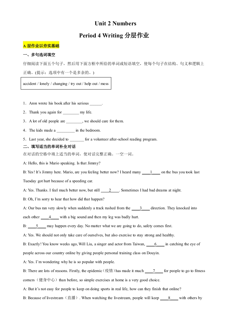 学生啦:Unit 2 NumbersPeriod4 Writing分层作业A层作业以夯实基础一、多句选词填空仔细阅读下面五个句子,然后用下面方框中所给的单词或短语填空,使每个句子在结构、句义和逻辑上正确。(提示:选项中有一个是多余的。)accident lonely changing try out/help out /mess1.Aron wrote his book after his serious2.Thank you again formy life3.A lot of old people arewe should care for them.4.The kids made ain the bedroom.5.Last year,she decided tofor a volunteer after-school reading program.二、填写适当的单词补全对话在对话的空格中填上适当的单词,使对话完整正确。一空一词。A:Hello,this is Mario speaking.Is that Jimmy?B:Yes!It's Jimmy here.Mario,are you feeling better now?I heard many 1 on the bus you took lastTuesday got hurt because of a speeding car.A:Yes.Thanks.I feel much better now,but still 2.Sometimes I had bad dreams at night.B:Oh,I'm sorry to hear that how did that happen?A:Our bus ran very slowly when suddenly a track rushed from the 3 direction.They knocked intoeach other 4 with a big sound and then my leg was badly hurt.B:5 may happen every day.No matter what we are going to do,safety comes first.A:Yes.We should not only take care of ourselves,but also exercise to stay strong and healthy.B:Exactly!You know weeks ago,Will Liu,a singer and actor from Taiwan,6 in catching the eye ofpeople across our country online by giving people personal training class on Douyin.A:Yes.I'm wondering why he is so popular with people.B:There are lots of reasons.Firstly,the epidemic (has made it much 7 for people to go to fitnesscomers(健身中心)than before,so simple exercises at home is a very good choice.A:But it's not easy for people to keep on doing sports in real life,how can they finish that online?B:Because of livestream ()When watching the livestream,people will keep 8 with others by