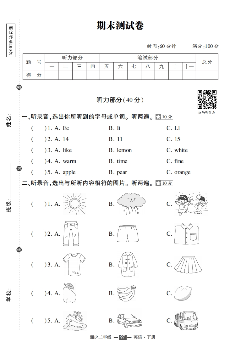 学生啦:期末测试卷创优作业00分时间:60分钟满分:100分听力部分笔试部分题号总分四五六七八九十得分听力部分(40分)▣一、听录音,选出你所听到的字母或单词。听两遍。★10分()1.A.EeC.LI()2.A.14B.11C.15)3.A.likeB.lemonC.white)4.A.warmB.timeC.fine到)5.A.appleB.pearC.orange二、听录音,选出与所听内容相符的图片。听两遍。10分TTT)2.B线)5.AB湘少三年级一97一英语·下册