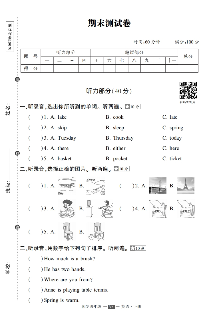 学生啦:期末测试卷创优作业00分时间:60分钟满分:100分听力部分笔试部分题号总分四五六七八九得分听力部分(40分)一、听录音,选出你所听到的单词。听两遍。☆10分()1.A.lakeB.cookC.late)2.A.skipB.sleepC.spring:)3.A.TuesdayB.ThursdayC.today)4.A.thereB.eitherC.here到)5.A.basketB.pocketC.ticket二、听录音,选择正确的图片。听两遍。☆10分2)3.AB)4.A线)5.A三、听录音,用数字给下列句子排序。听两遍。★0分()How much is a brush?)He has two hands()Where are you from?)Anne is playing table tennis.)Spring is warm.湘少四年级一97一英语·下册