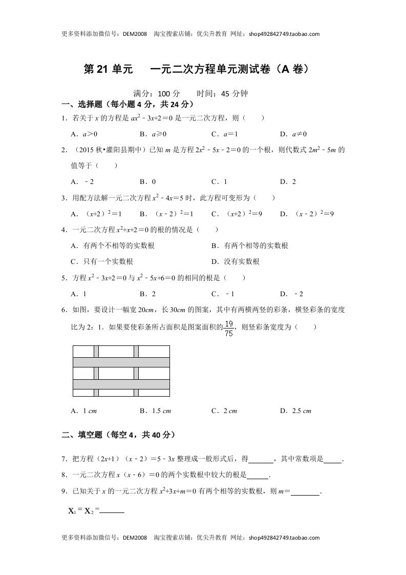 人教版初中九年级数学第21单元 一元二次方程单元测试卷(A卷)(人教版)
