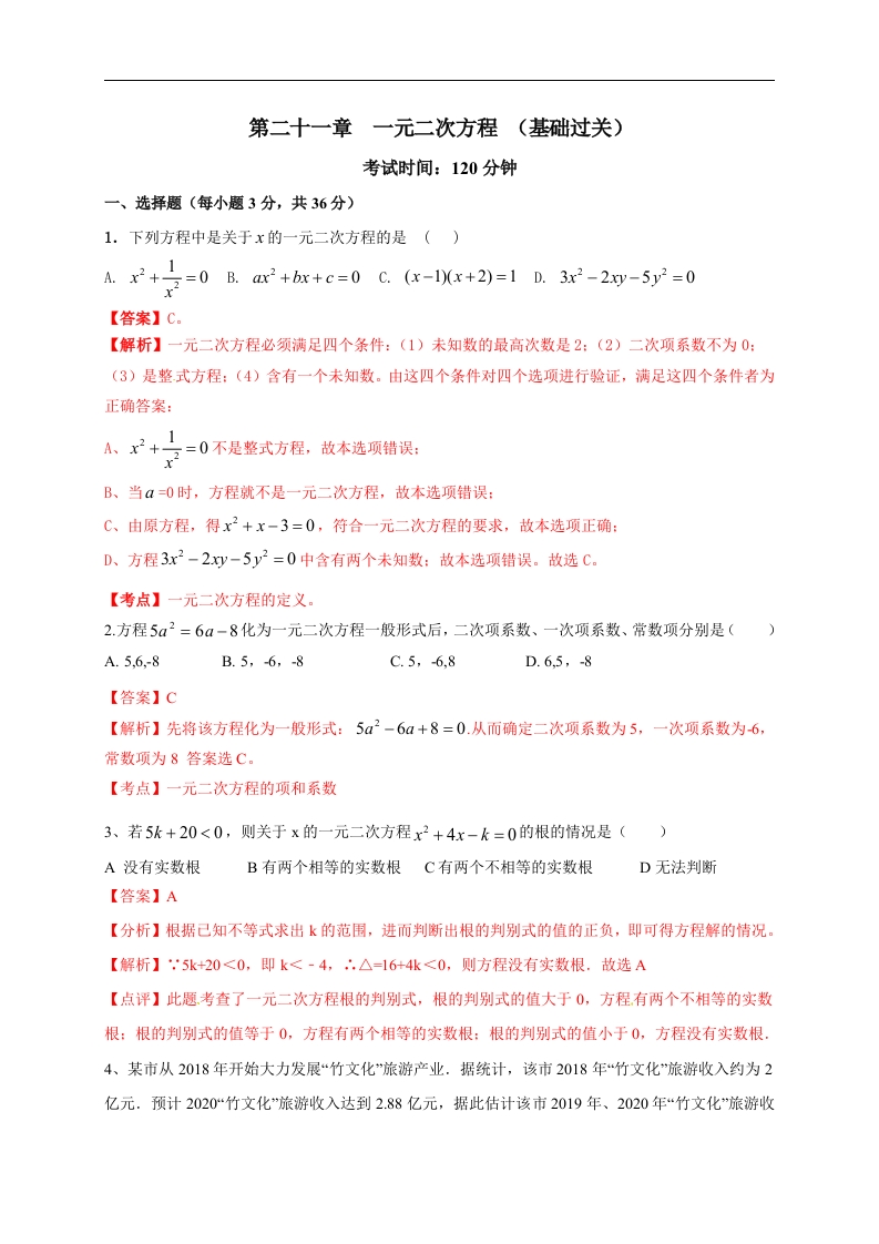 首页初中数学九年级人教版初中九年级数学第二十一章 一元二次方程(基础过关)(解析版)
