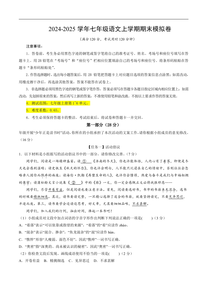 七年级语文期末模拟卷02(全解全析)(统编版2024通用)