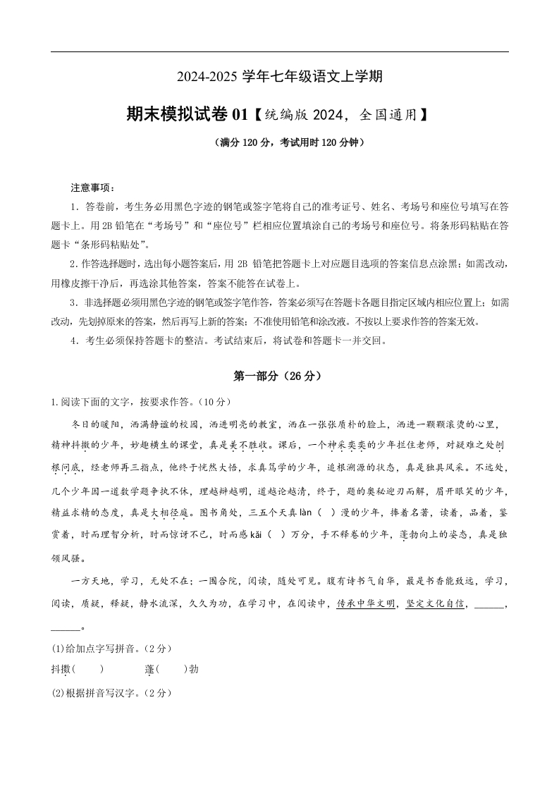 首页初中语文七年级期末模拟试卷01(原卷版)