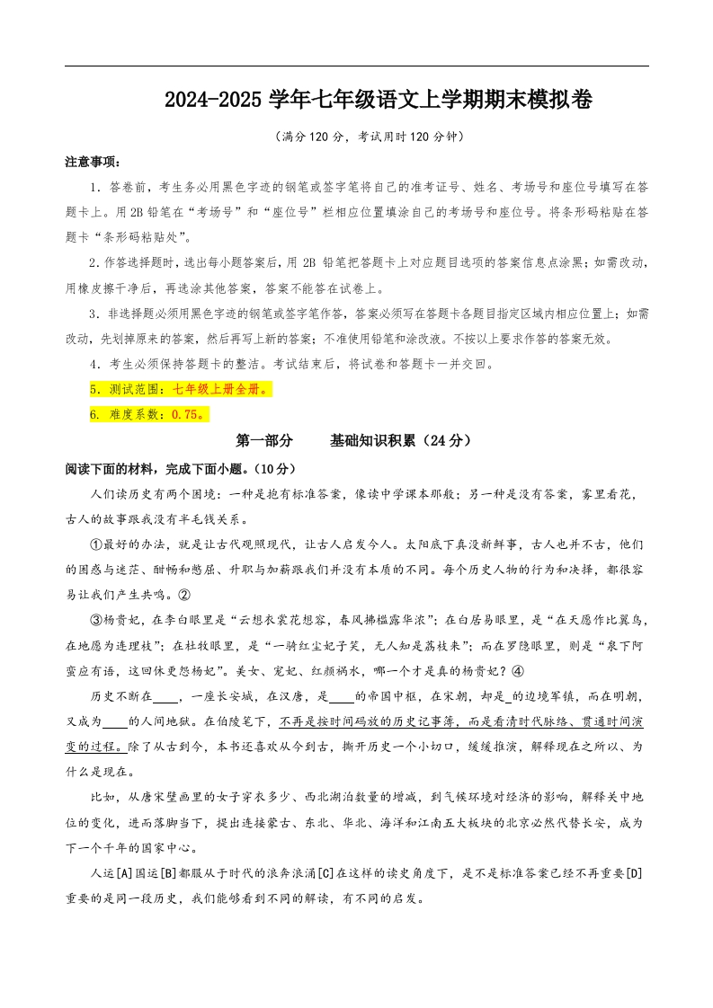 七年级语文期末模拟卷(考试版A4)(五四制通用)