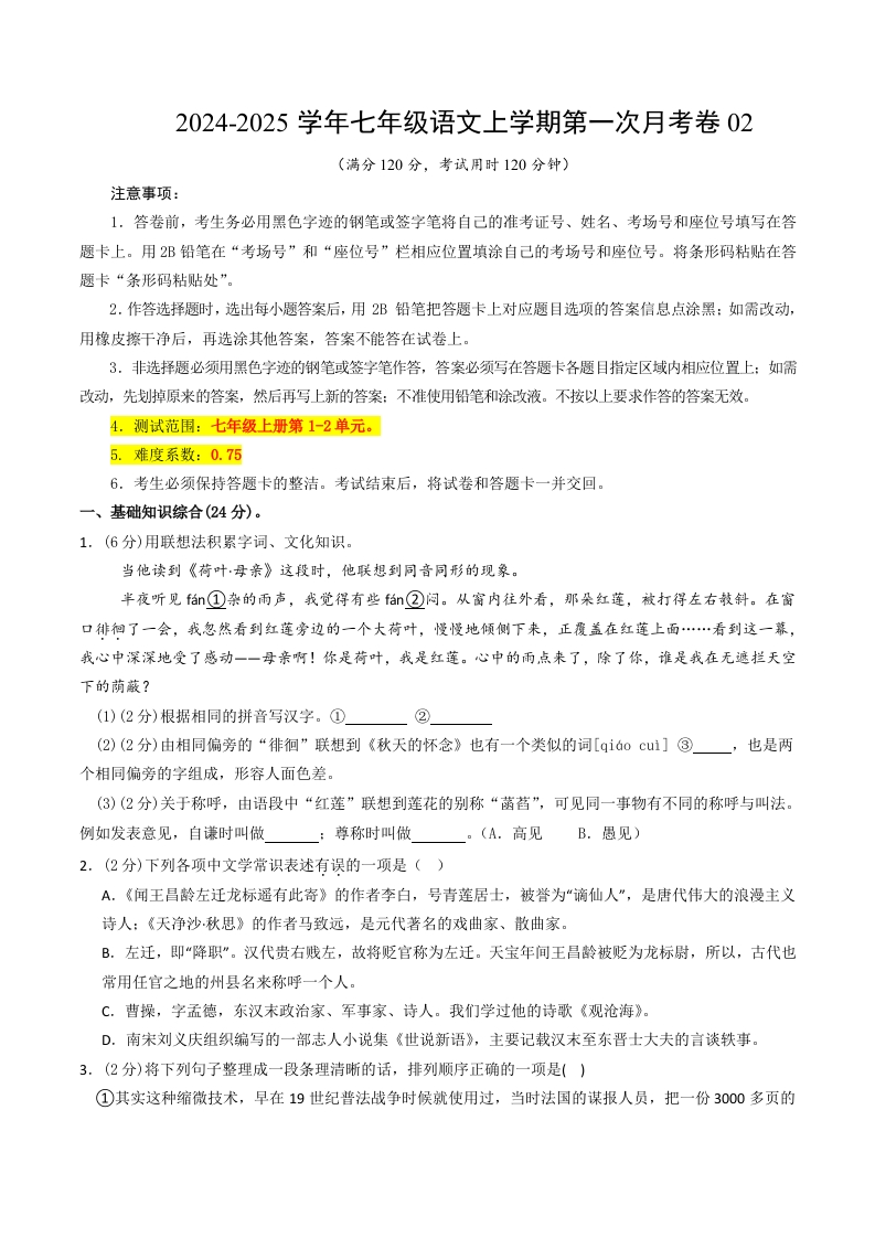 七年级语文第一次月考卷02(考试版A4)【测试范围:上册第1~2单元】(统编版)