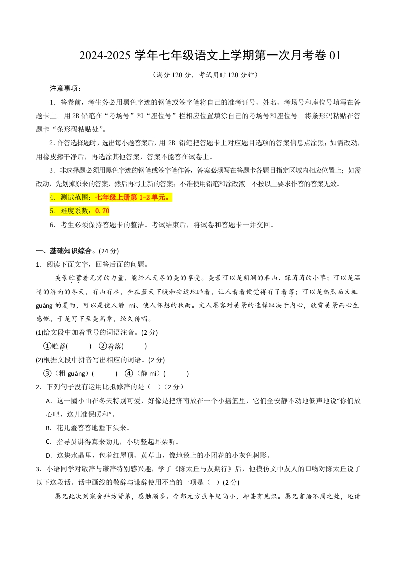 七年级语文第一次月考卷01(考试版A4)【测试范围:上册第1~2单元】(统编版)