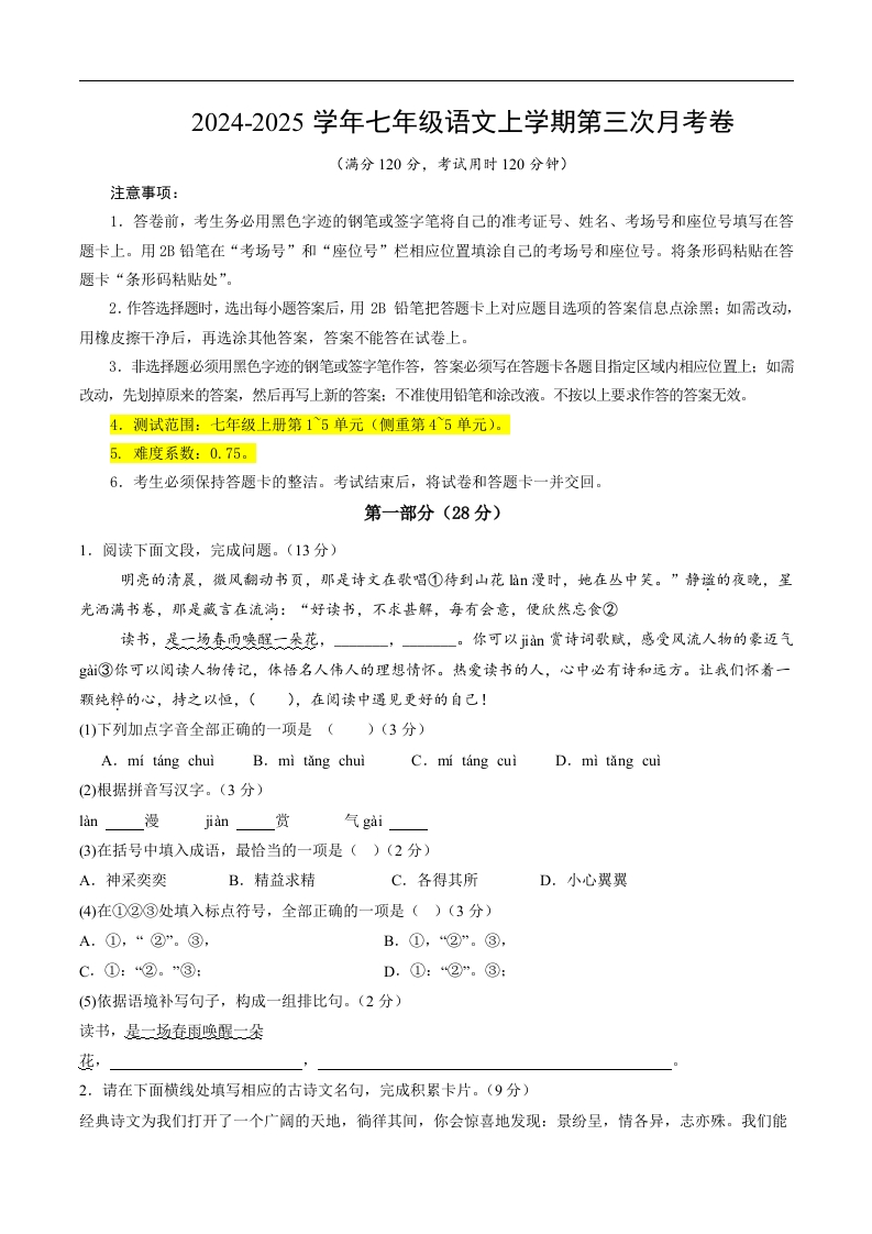 首页初中语文七年级七年级语文第三次月考卷02(考试版A4)【测试范围:上册第1~5单元】(统编版2024通用)