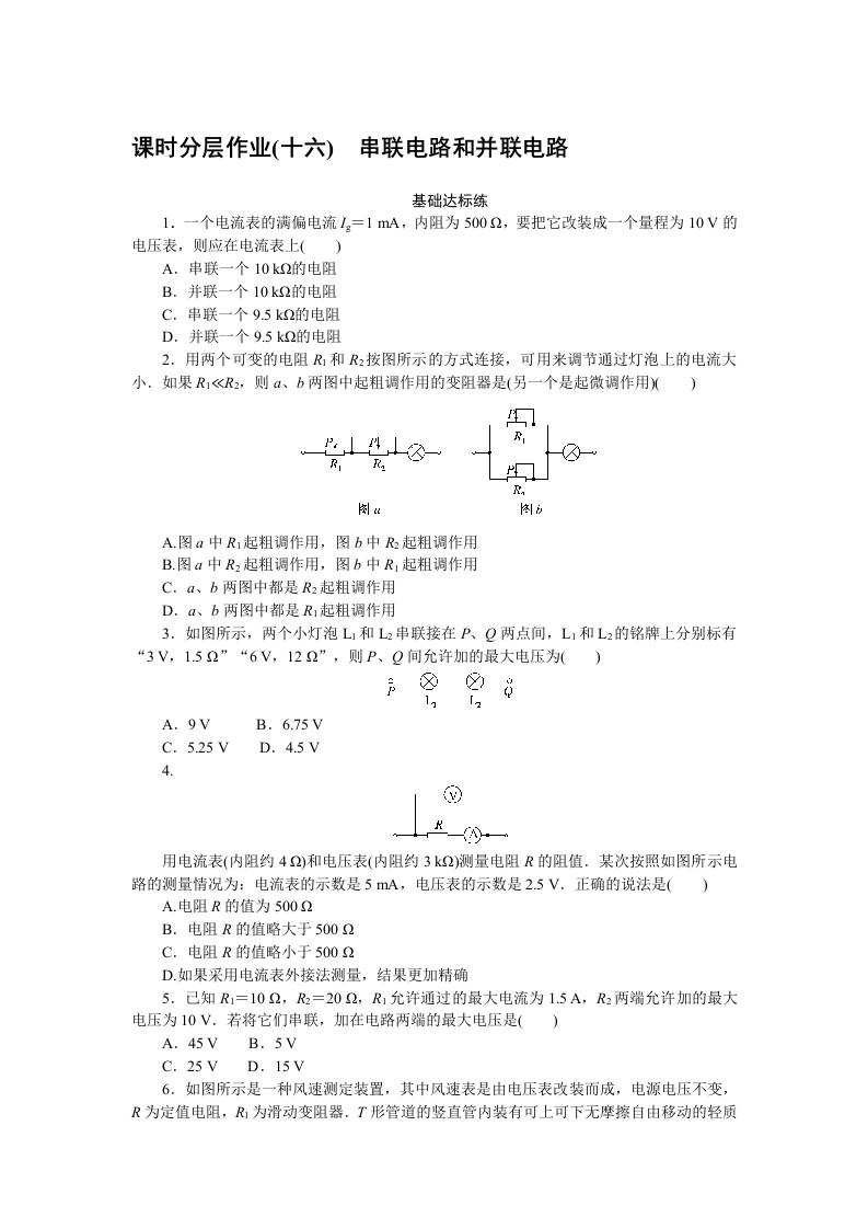 学生啦:课时分层作业(十六)串联电路和并联电路基础达标练1.一个电流表的满偏电流I。=1mA,内阻为5002,要把它改装成一个量程为10V的电压表,则应在电流表上()A.串联一个10k2的电阻B.并联一个10k2的电阻C.串联一个9.5k的电阻D.并联一个9.5k2的电阻2.用两个可变的电阻R和R2按图所示的方式连接,可用来调节通过灯泡上的电流大小.如果R1《R2,则a、b两图中起粗调作用的变阻器是(另一个是起微调作用)()A.图a中R,起粗调作用,图b中R2起粗调作用B.图a中R2起粗调作用,图b中R1起粗调作用C.a、b两图中都是R2起粗调作用D.a、b两图中都是R1起粗调作用3.如图所示,两个小灯泡L1和L2串联接在P、Q两点间,L1和L2的铭牌上分别标有“3V,1.52”“6V,122”,则P、Q间允许加的最大电压为()A.9VB.6.75VC.5.25VD.4.5V4.用电流表(内阻约42)和电压表(内阻约3k2)测量电阻R的阻值.某次按照如图所示电路的测量情况为:电流表的示数是5mA,电压表的示数是2.5V.正确的说法是()A.电阻R的值为500B.电阻R的值略大于5002C.电阻R的值略小于5002D.如果采用电流表外接法测量,结果更加精确5.己知R1=102,R=202,R1允许通过的最大电流为1.5A,R2两端允许加的最大电压为10V.若将它们串联,加在电路两端的最大电压是()A.45V B.5VC.25VD.15V6.如图所示是一种风速测定装置,其中风速表是由电压表改装而成,电源电压不变,R为定值电阻,R为滑动变阻器.T形管道的竖直管内装有可上可下无摩擦自由移动的轻质