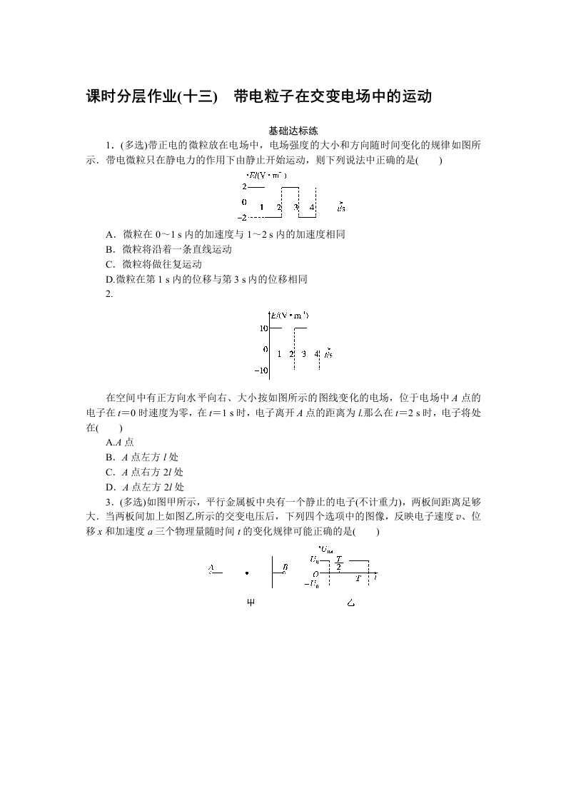 学生啦:课时分层作业(十三)带电粒子在交变电场中的运动基础达标练1.(多选)带正电的微粒放在电场中,电场强度的大小和方向随时间变化的规律如图所示.带电微粒只在静电力的作用下由静止开始运动,则下列说法中正确的是()34-2-A.微粒在0~1s内的加速度与1~2s内的加速度相同B.微粒将沿着一条直线运动C.微粒将做往复运动D.微粒在第1s内的位移与第3s内的位移相同2.10在空间中有正方向水平向右、大小按如图所示的图线变化的电场,位于电场中A点的电子在=0时速度为零,在=1s时,电子离开A点的距离为1那么在=2s时,电子将处AA点B.A点左方1处C.A点右方21处D.A点左方21处3.(多选)如图甲所示,平行金属板中央有一个静止的电子(不计重力),两板间距离足够大.当两板间加上如图乙所示的交变电压后,下列四个选项中的图像,反映电子速度、位移x和加速度a三个物理量随时间t的变化规律可能正确的是()了
