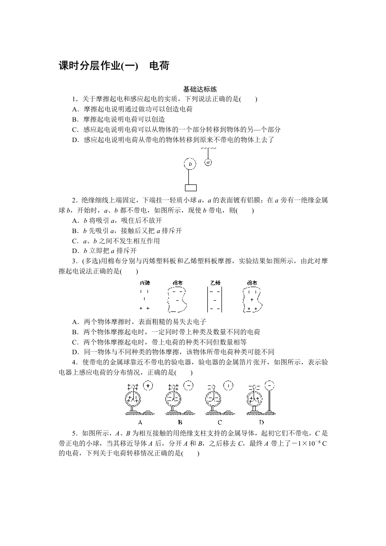 学生啦:课时分层作业(一)电荷基础达标练1.关于摩擦起电和感应起电的实质,下列说法正确的是()A.摩擦起电说明通过做功可以创造电荷B.摩擦起电说明电荷可以创造C.感应起电说明电荷可以从物体的一个部分转移到物体的另一个部分D.感应起电说明电荷从带电的物体转移到原来不带电的物体上去了2.绝缘细线上端固定,下端挂一轻质小球a,a的表面镀有铝膜:在a旁有一绝缘金属球b,开始时,a、b都不带电,如图所示,现使b带电,则()A.b将吸引a,吸住后不放开B.b先吸引a,接触后又把a排斥开C.a、b之间不发生相互作用D.b立即把a排斥开3.(多选)用棉布分别与丙烯塑料板和乙烯塑料板摩擦,实验结果如图所示,由此对摩擦起电说法正确的是()++A.两个物体摩擦时,表面粗糙的易失去电子B.两个物体摩擦起电时,一定同时带上种类及数量不同的电荷C.两个物体摩擦起电时,带上电荷的种类不同但数量相等D.同一物体与不同种类的物体摩擦,该物体所带电荷种类可能不同4.使带电的金属球靠近不带电的验电器,验电器的金属箔片张开,如图所示,表示验电器上感应电荷的分布情况,正确的是(5.如图所示,A、B为相互接触的用绝缘支柱支持的金属导体,起初它们不带电,C是带正电的小球,当其移近导体A后,分开A和B,之后移去C,最终A带上了一1×108C的电荷,下列关于电荷转移情况正确的是()