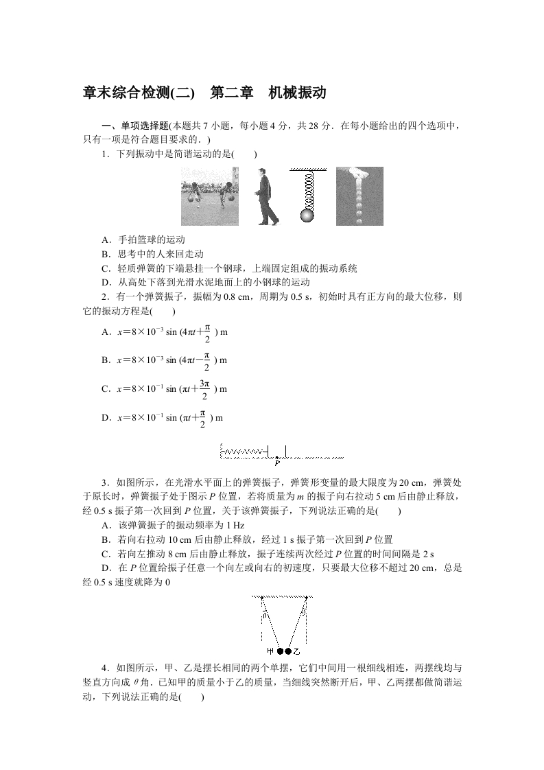 学生啦:章末综合检测(二)第二章机械振动一、单项选择题(本题共7小题,每小题4分,共28分.在每小题给出的四个选项中,只有一项是符合题目要求的.)1,下列振动中是简谐运动的是(A,手拍篮球的运动B.思考中的人来回走动C.轻质弹簧的下端悬挂一个钢球,上端固定组成的振动系统D.从高处下落到光滑水泥地面上的小钢球的运动2.有一个弹簧振子,振幅为0.8cm,周期为0.5s,初始时具有正方向的最大位移,则它的振动方程是(22C.x=8×101sim(+3证)mD.x=8×101sin(+g)m3.如图所示,在光滑水平面上的弹簧振子,弹簧形变量的最大限度为20cm,弹簧处于原长时,弹簧振子处于图示P位置,若将质量为m的振子向右拉动5cm后由静止释放,经0.5s振子第一次回到P位置,关于该弹簧振子,下列说法正确的是()A.该弹簧振子的振动频率为1HzB.若向右拉动10cm后由静止释放,经过1s振子第一次回到P位置C.若向左推动8cm后由静止释放,振子连续两次经过P位置的时间间隔是2sD.在P位置给振子任意一个向左或向右的初速度,只要最大位移不超过20cm,总是经0.5s速度就降为0州◆◆乙4.如图所示,甲、乙是摆长相同的两个单摆,它们中间用一根细线相连,两摆线均与竖直方向成0角.己知甲的质量小于乙的质量,当细线突然断开后,甲、乙两摆都做简谐运动,下列说法正确的是()