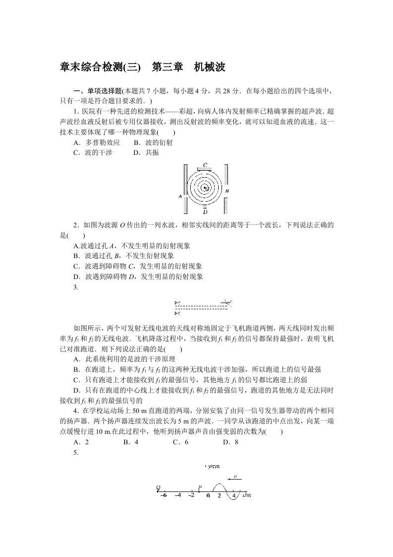 学生啦:章末综合检测(三)第三章机械波一、单顶选择题(本题共7小题,每小题4分,共28分,在每小题给出的四个选项中,只有一项是符合题目要求的.)1.医院有一种先进的检测技术一彩超,向病人体内发射频率己精确掌握的超声波.超声波经血液反射后被专用仪器接收,测出反射波的频率变化,就可以知道血液的流速.这一技术主要体现了哪一种物理现象()A.多普勒效应B.波的衍射C.波的干涉D.共振2.如图为波源O传出的一列水波,相邻实线间的距离等于一个波长,下列说法正确的是()A.波通过孔A,不发生明显的衍射现象B.波通过孔B,不发生衍射现象C.波遇到障碍物C,发生明显的衍射现象D.波遇到障碍物D,发生明显的衍射现象3.如图所示,两个可发射无线电波的天线对称地固定于飞机跑道两侧,两天线同时发出频率为和五的无线电波.飞机降落过程中,当接收到万和的信号都保持最强时,表明飞机己对准跑道.则下列说法正确的是()A,此系统利用的是波的干涉原理B.在跑道上,频率为与的这两种无线电波干涉加强,所以跑道上的信号最强C.只有跑道上才能接收到的最强信号,其他地方的信号都比跑道上的弱D.只有在跑道的中心线上才能接收到和的最强信号,跑道的其他地方是无法同时接收到6和6的最强信号的4.在学校运动场上50m直跑道的两端,分别安装了由同一信号发生器带动的两个相同的扬声器.两个扬声器连续发出波长为5m的声波.一同学从该跑道的中点出发,向某一端点缓慢行进10m.在此过程中,他听到扬声器声音由强变弱的次数为()A.2B.4C.6D.85.