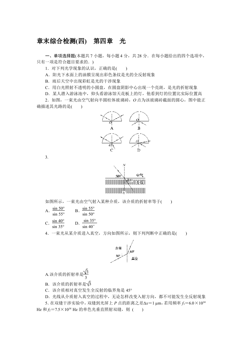 学生啦:章末综合检测(四)第四章光一、单项选择题(本题共7小题,每小题4分,共28分.在每小题给出的四个选项中,只有一项是符合题目要求的.)1.对下列光学现象的认识,正确的是()A.阳光下水面上的油膜呈现出彩色条纹是光的全反射现象B.雨后天空中出现彩虹是光的干涉现象C.用白光照射不透明的小圆盘,在圆盘阴影中心出现一个亮斑,是光的折射现象D.某人潜入游泳池中,仰头看游泳馆天花板上的灯,他看到灯的位置比实际位置高2.如图,一束光由空气射向半圆柱体玻璃砖,O点为该玻璃砖截面的圆心,图中能正确描述其光路的是()3.如图所示,一束光由空气射入某种介质,该介质的折射率等于()A.sin50°sin50°sin35°D.sin 350sin40°4.一束光从某介质进入真空,方向如图所示,则下列判断中正确的是()A该介质的折射率是3B.该介质的折射率是BC.该介质相对真空发生全反射的临界角是45D.光线从介质射入真空的过程中,无论怎样改变入射方向,都不可能发生全反射现象5.在双缝干涉实验中,双缝到光屏上P点的距离之差△x=1Hm,若用频率=6.0×1014Hz和2=7.5×104Hz的单色光垂直照射双缝,则()