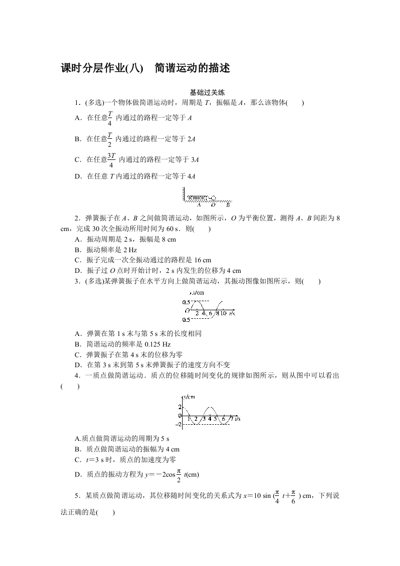 学生啦:课时分层作业(八)简谐运动的描述基础过关练1.(多选)一个物体做简谐运动时,周期是T,振幅是A,那么该物体()A.在任意I内通过的路程一定等于AB.在任意工内通过的路程一定等于2AC.在任意3江内通过的路程一定等于34D.在任意T内通过的路程一定等于4A习2.弹簧振子在A、B之间做简谐运动,如图所示,O为平衡位置,测得A、B间距为8cm,完成30次全振动所用时间为60s.则()A.振动周期是2s,振幅是8cmB.振动频率是2HzC.振子完成一次全振动通过的路程是16cmD.振子过O点时开始计时,2s内发生的位移为4cm3.(多选)某弹簧振子在水平方向上做简谐运动,其振动图像如图所示,则()cmA.弹簧在第1s末与第5s末的长度相同B.简谐运动的频率是0.125HzC.弹簧振子在第4s末的位移为零D.在第3s末到第5s末弹簧振子的速度方向不变4.一质点做简谐运动.质点的位移随时间变化的规律如图所示,则从图中可以看出2A.质点做简谐运动的周期为5sB.质点做简谐运动的振幅为4cmC.t=3s时,质点的加速度为零D.质点的振动方程为y=一2cos无(cm)法正确的是()