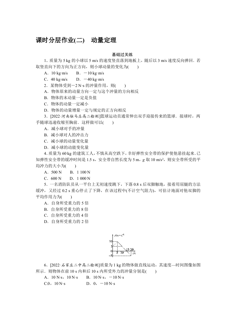 学生啦:课时分层作业(二)动量定理基础过关练1.质量为5kg的小球以5ms的速度竖直落到地板上,随后以3ms速度反向弹回.若取竖直向下的方向为正方向,则小球动量的变化为()A.10 kg'm/s B.-10 kg'm/sC.40 kg'm/s D.-40 kg'm/s2.某物体受到一2Ns的冲量作用,则(A.物体原来的动量方向一定与这个冲量的方向相反B.物体的末动量一定是负值C.物体的动量一定减小D.物体的动量增量一定与规定的正方向相反3.[2022·河南驻马店高二检测]篮球运动员通常伸出双手迎接传来的篮球.接球时,两手随球迅速收缩至胸前.这样做可以()A.减小球对手的冲量B.减小球对人的冲击力C.减小球的动量变化量D.减小球的动能变化量4.质量为60kg的建筑工人,不慎从高空跌下,幸好弹性安全带的保护使他悬挂起来.己知弹性安全带的缓冲时间是1.5s,安全带自然长度为5m,g取10ms2,则安全带所受的平均冲力的大小为()A.500NB.1100NC.600ND.1000N5.一名消防队员从一平台上无初速度跳下,下落0.8s后双脚触地,接着用屈腿的方法缓冲,又经过0.2s重心停止了下降,在该过程中(不计空气阻力),可估计地面对他双脚的平均作用力为()A.自身所受重力的5倍B.自身所受重力的8倍C.自身所受重力的4倍D.自身所受重力的2倍6.[2022·石家庄二中高二检测]质量为1kg的物体做直线运动,其速度一时间图像如图所示.则物体在前10s内和后10s内所受外力的冲量分别是()C.0,10NsD.0,-10Ns