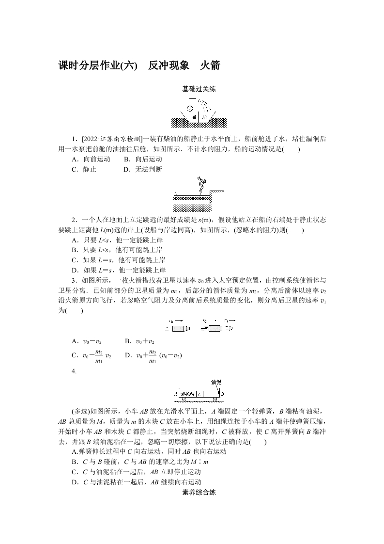 学生啦:课时分层作业(六)反冲现象火箭基础过关练1.[2022·江苏南京检测]一装有柴油的船静止于水平面上,船前舱进了水,堵住漏洞后用一水泵把前舱的油抽往后舱,如图所示.不计水的阻力,船的运动情况是()A.向前运动B.向后运动C.静止D.无法判断2.一个人在地面上立定跳远的最好成绩是s(m),假设他站立在船的右端处于静止状态要跳上距离他L(m)远的岸上(设船与岸边同高),如图所示,(忽略水的阻力)则()A.只要L