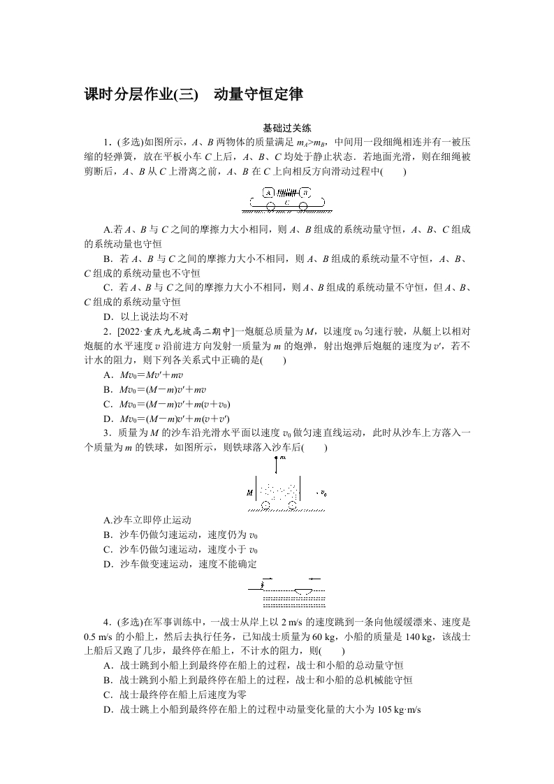 学生啦:课时分层作业(三)动量守恒定律基础过关练1.(多选)如图所示,A、B两物体的质量满足m>ma,中间用一段细绳相连并有一被压缩的轻弹簧,放在平板小车C上后,A、B、C均处于静止状态.若地面光滑,则在细绳被剪断后,A、B从C上滑离之前,A、B在C上向相反方向滑动过程中()A若A、B与C之间的摩擦力大小相同,则A、B组成的系统动量守恒,A、B、C组成的系统动量也守恒B.若A、B与C之间的摩擦力大小不相同,则A、B组成的系统动量不守恒,A、B、C组成的系统动量也不守恒C.若A、B与C之间的摩擦力大小不相同,则A、B组成的系统动量不守恒,但A、B、C组成的系统动量守恒D.以上说法均不对2.[2022重庆九龙坡高二期中]一炮艇总质量为M,以速度o匀速行驶,从艇上以相对炮艇的水平速度沿前进方向发射一质量为m的炮弹,射出炮弹后炮艇的速度为',若不计水的阻力,则下列各关系式中正确的是()3.质量为M的沙车沿光滑水平面以速度%做匀速直线运动,此时从沙车上方落入一个质量为m的铁球,如图所示,则铁球落入沙车后()A.沙车立即停止运动B.沙车仍做匀速运动,速度仍为C.沙车仍做匀速运动,速度小于%D.沙车做变速运动,速度不能确定4.(多选)在军事训练中,一战士从岸上以2ms的速度跳到一条向他缓缓漂来、速度是0.5ms的小船上,然后去执行任务,己知战士质量为60kg,小船的质量是140kg,该战士上船后又跑了几步,最终停在船上,不计水的阻力,则()A,战士跳到小船上到最终停在船上的过程,战士和小船的总动量守恒B.战士跳到小船上到最终停在船上的过程,战士和小船的总机械能守恒C.战士最终停在船上后速度为零D.战士跳上小船到最终停在船上的过程中动量变化量的大小为105kgms