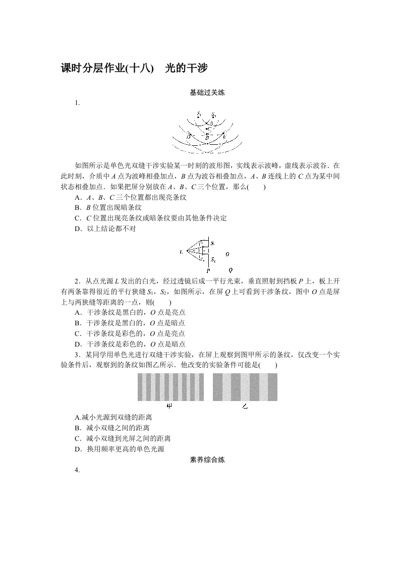 学生啦:课时分层作业(十八)光的干涉基础过关练1.如图所示是单色光双缝干涉实验某一时刻的波形图,实线表示波峰,虚线表示波谷.在此时刻,介质中A点为波峰相叠加点,B点为波谷相叠加点,A、B连线上的C点为某中间状态相叠加点,如果把屏分别放在A、B、C三个位置,那么()A,A、B、C三个位置都出现亮条纹B.B位置出现暗条纹C.C位置出现亮条纹或暗条纹要由其他条件决定D.以上结论都不对2.从点光源L发出的白光,经过透镜后成一平行光束,垂直照射到挡板P上,板上开有两条靠得很近的平行狭缝S,S2,如图所示,在屏Q上可看到干涉条纹,图中O点是屏上与两狭缝等距离的一点,则()A.干涉条纹是黑白的,O点是亮点B.干涉条纹是黑白的,O点是暗点C.干涉条纹是彩色的,O点是亮点D.干涉条纹是彩色的,O点是暗点3.某同学用单色光进行双缝干涉实验,在屏上观察到图甲所示的条纹,仅改变一个实验条件后,观察到的条纹如图乙所示,他改变的实验条件可能是()A.减小光源到双缝的距离B.减小双缝之间的距离C.减小双缝到光屏之间的距离D.换用频率更高的单色光源素养综合练4.