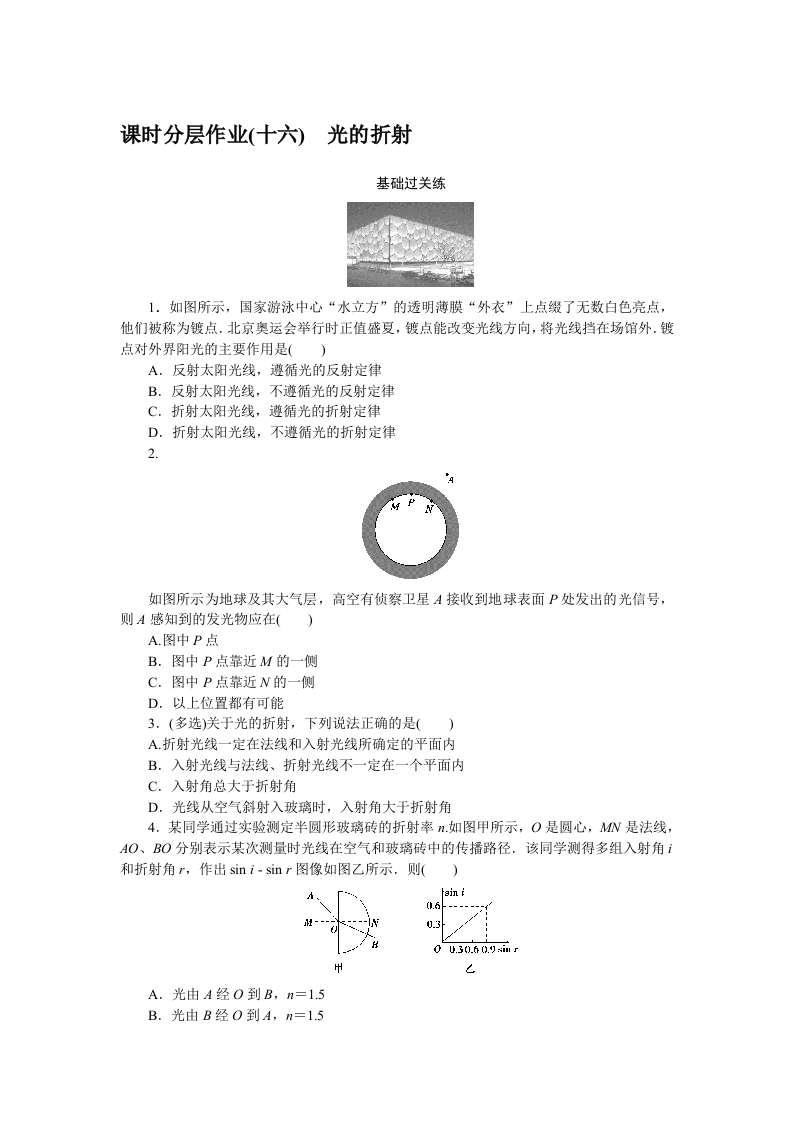 学生啦:课时分层作业(十六)光的折射基础过关练1.如图所示,国家游泳中心“水立方”的透明薄膜“外衣”上点缀了无数白色亮点,他们被称为镀点.北京奥运会举行时正值盛夏,镀点能改变光线方向,将光线挡在场馆外.镀点对外界阳光的主要作用是()A.反射太阳光线,遵循光的反射定律B.反射太阳光线,不遵循光的反射定律C.折射太阳光线,遵循光的折射定律D.折射太阳光线,不遵循光的折射定律如图所示为地球及其大气层,高空有侦察卫星A接收到地球表面P处发出的光信号,则A感知到的发光物应在()A.图中P点B.图中P点靠近M的一侧C.图中P点靠近N的一侧D.以上位置都有可能3.(多选)关于光的折射,下列说法正确的是()A.折射光线一定在法线和入射光线所确定的平面内B.入射光线与法线、折射光线不一定在一个平面内C.入射角总大于折射角D.光线从空气斜射入玻璃时,入射角大于折射角4.某同学通过实验测定半圆形玻璃砖的折射率如图甲所示,O是圆心,MW是法线,AO、BO分别表示某次测量时光线在空气和玻璃砖中的传播路径.该同学测得多组入射角i和折射角r,作出sini-sinr图像如图乙所示.则()A.光由A经O到B,n=1.5B.光由B经O到A,n=1.5