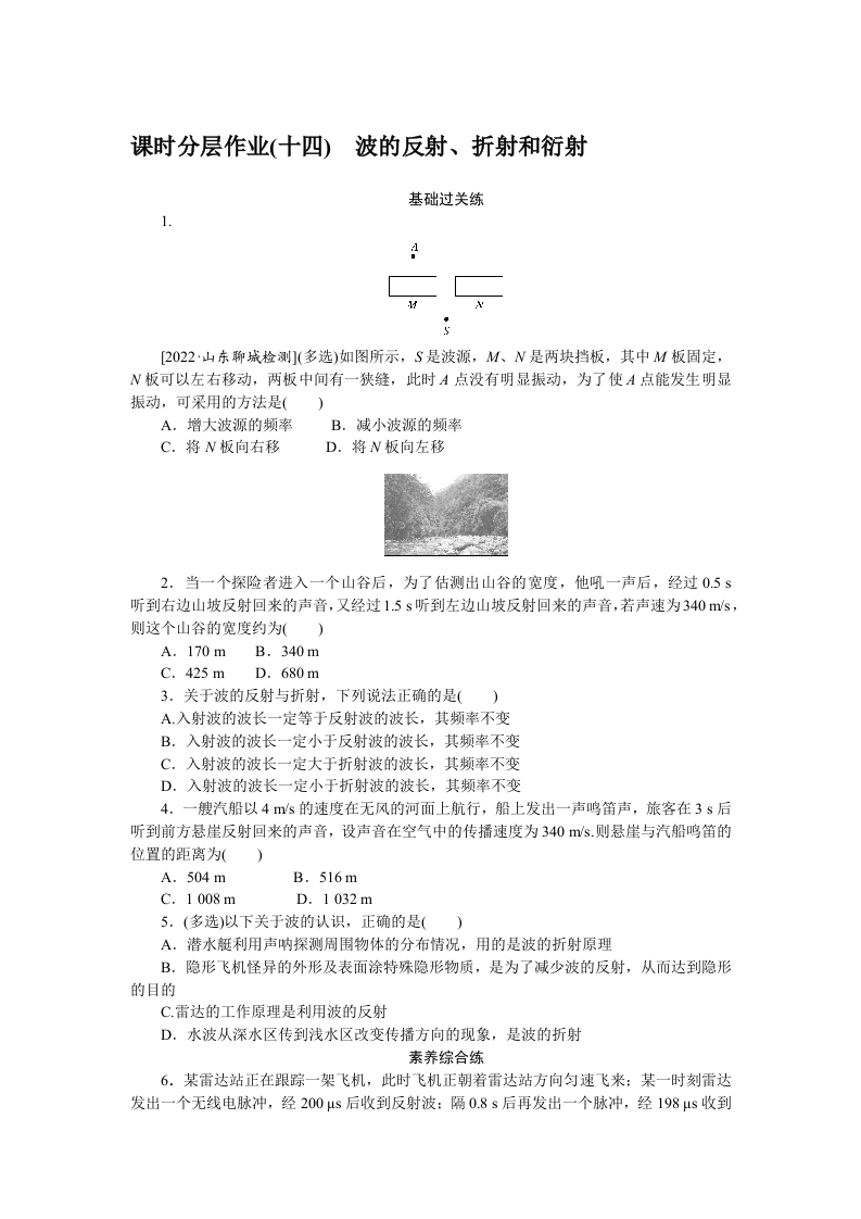学生啦:课时分层作业(十四)波的反射、折射和衍射基础过关练1.[2022·山东聊城检测](多选)如图所示,S是波源,M、N是两块挡板,其中M板固定,N板可以左右移动,两板中间有一狭缝,此时A点没有明显振动,为了使A点能发生明显振动,可采用的方法是()A.增大波源的频率B.减小波源的频率C.将N板向右移D.将N板向左移2.当一个探险者进入一个山谷后,为了估测出山谷的宽度,他吼一声后,经过0.5s听到右边山坡反射回来的声音,又经过1.5s听到左边山坡反射回来的声音,若声速为340ms,则这个山谷的宽度约为()A.170mB.340mC.425mD.680m3.关于波的反射与折射,下列说法正确的是()A.入射波的波长一定等于反射波的波长,其频率不变B.入射波的波长一定小于反射波的波长,其频率不变C.入射波的波长一定大于折射波的波长,其频率不变D.入射波的波长一定小于折射波的波长,其频率不变4.一艘汽船以4ms的速度在无风的河面上航行,船上发出一声鸣笛声,旅客在3s后听到前方悬崖反射回来的声音,设声音在空气中的传播速度为340ms.则悬崖与汽船鸣笛的位置的距离为()A.504mB.516mC.1008mD.1032m5.(多选)以下关于波的认识,正确的是()A.潜水艇利用声呐探测周围物体的分布情况,用的是波的折射原理B.隐形飞机怪异的外形及表面涂特殊隐形物质,是为了减少波的反射,从而达到隐形的目的C.雷达的工作原理是利用波的反射D.水波从深水区传到浅水区改变传播方向的现象,是波的折射素养综合练6.某雷达站正在跟踪一架飞机,此时飞机正朝着雷达站方向匀速飞来:某一时刻雷达发出一个无线电脉冲,经200μs后收到反射波:隔0.8s后再发出一个脉冲,经198μs收到
