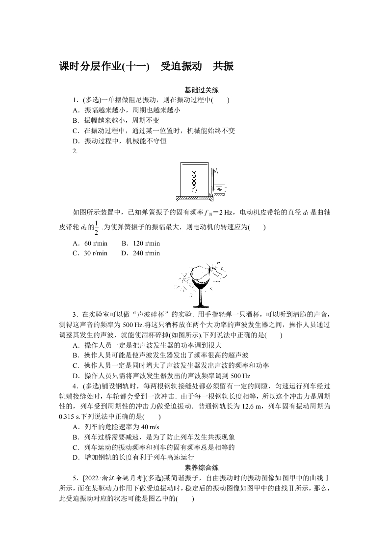 学生啦:课时分层作业(十一)受迫振动共振基础过关练1.(多选)一单摆做阻尼振动,则在振动过程中(A.振幅越来越小,周期也越来越小B.振幅越来越小,周期不变C.在振动过程中,通过某一位置时,机械能始终不变D.振动过程中,机械能不守恒2.如图所示装置中,己知弹簧振子的固有频率f=2Hz,电动机皮带轮的直径d山是曲轴皮带轮山的上.为使弹簧振子的振幅最大,则电动机的转速应为()A.60 r/minB.120 r/minC.30 r/minD.240 r/min3.在实验室可以做“声波碎杯”的实验。用手指轻弹一只酒杯,可以听到清脆的声音,测得这声音的频率为500Hz.将这只酒杯放在两个大功率的声波发生器之间,操作人员通过调整其发生的声波,就能使酒杯碎掉(如图所示).下列说法中正确的是()A.操作人员一定是把声波发生器的功率调到很大B.操作人员可能是使声波发生器发出了频率很高的超声波C.操作人员一定是同时增大了声波发生器发出声波的频率和功率D.操作人员只需将声波发生器发出的声波频率调到500Hz4.(多选)铺设钢轨时,每两根钢轨接缝处都必须留有一定的间隙,匀速运行列车经过轨端接缝处时,车轮都会受到一次冲击.由于每一根钢轨长度相等,所以这个冲击力是周期性的,列车受到周期性的冲击力做受迫振动.普通钢轨长为12.6m,列车固有振动周期为0.315s.下列说法中正确的是(A.列车的危险速率为40m/sB.列车过桥需要减速,是为了防止列车发生共振现象C.列车运动的振动频率和列车的固有频率总是相等的D.增加钢轨的长度有利于列车高速运行素养综合练5.[2022·浙江余姚月考](多选)某简谐振子,自由振动时的振动图像如图甲中的曲线I所示,而在某驱动力作用下做受迫振动时,稳定后的振动图像如图甲中的曲线Ⅱ所示,那么,此受迫振动对应的状态可能是图乙中的()