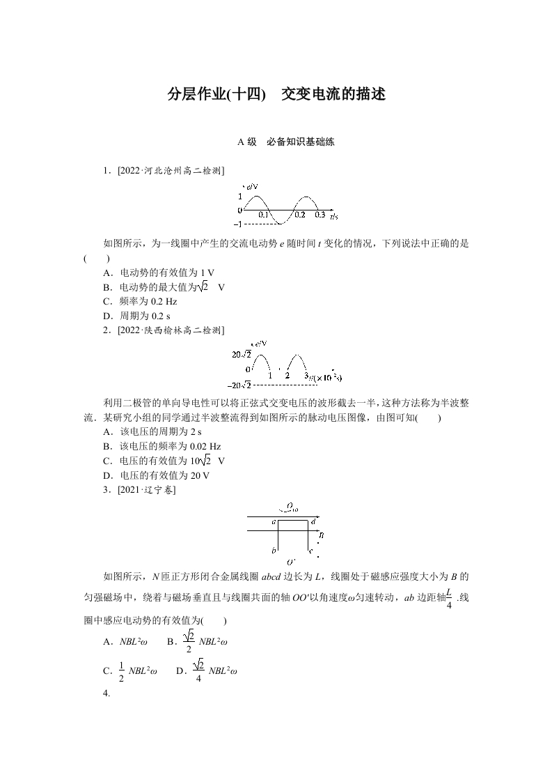 学生啦:分层作业(十四)交变电流的描述A级必备知识基础练1.[2022·河北沧州高二检测]1如图所示,为一线圈中产生的交流电动势随时间t变化的情况,下列说法中正确的是A.电动势的有效值为1VB.电动势的最大值为2VC.频率为0.2HzD.周期为0.2s2.[2022陕西榆林高二检测]202-202---利用二极管的单向导电性可以将正弦式交变电压的波形截去一半,这种方法称为半波整流.某研究小组的同学通过半波整流得到如图所示的脉动电压图像,由图可知()A.该电压的周期为2sB.该电压的频率为0.02HzC.电压的有效值为10W2VD.电压的有效值为20V3.[2021辽宁卷]如图所示,N匝正方形闭合金属线圈abcd边长为L,线圈处于磁感应强度大小为B的匀强磁场中,绕着与磁场垂直且与线圈共面的轴O0以角速度ω匀速转动,ab边距轴上线圈中感应电动势的有效值为(44.