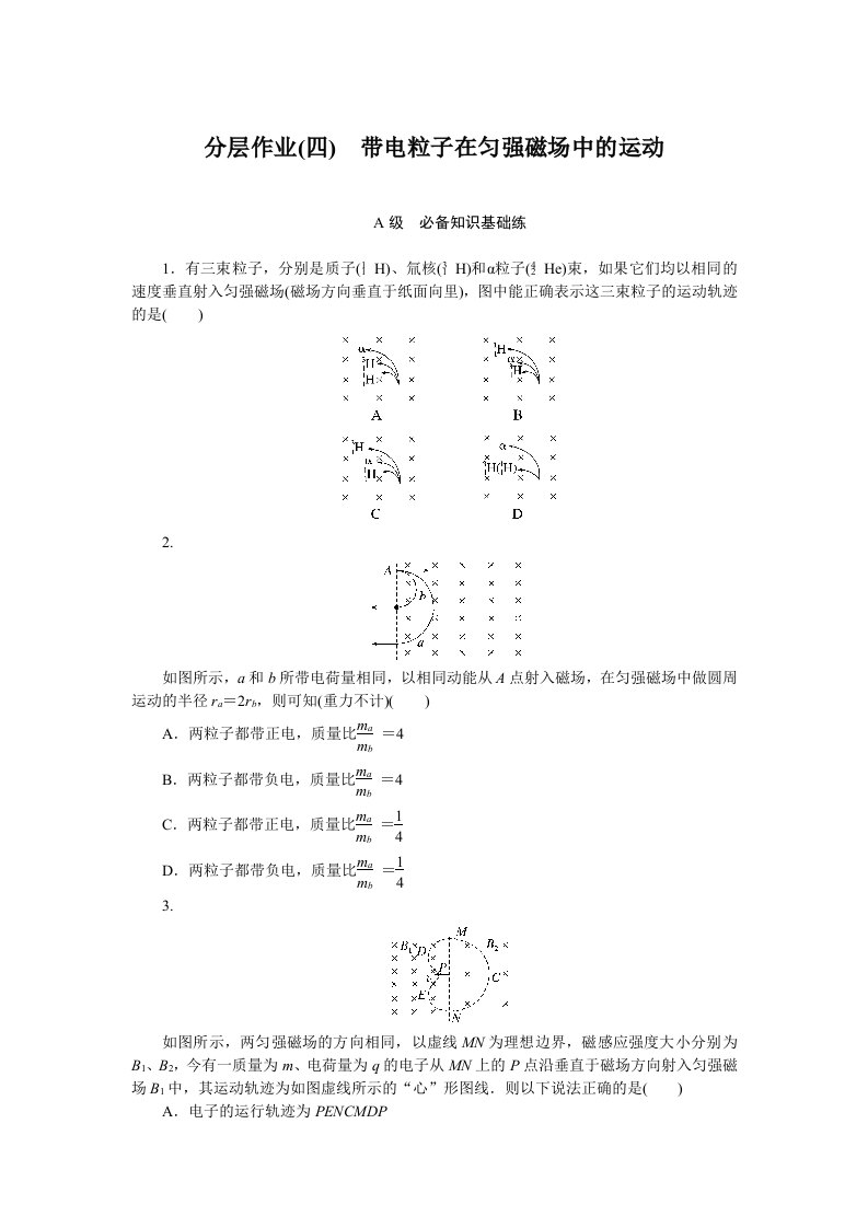 学生啦:分层作业(四)带电粒子在匀强磁场中的运动A级必备知识基础练1.有三束粒子,分别是质子(D、氚核(GHD和α粒子(佳H©)束,如果它们均以相同的速度垂直射入匀强磁场(磁场方向垂直于纸面向里),图中能正确表示这三束粒子的运动轨迹的是()2.如图所示,α和b所带电荷量相同,以相同动能从A点射入磁场,在匀强磁场中做圆周运动的半径ra=2r,则可知(重力不计()A.两粒子都带正电,质量比=4B.两粒子都带负电,质量比=43.如图所示,两匀强磁场的方向相同,以虚线MN为理想边界,磁感应强度大小分别为B1、B2,今有一质量为m、电荷量为g的电子从MN上的P点沿垂直于磁场方向射入匀强磁场B,中,其运动轨迹为如图虚线所示的“心”形图线.则以下说法正确的是()A.电子的运行轨迹为PENCMDP