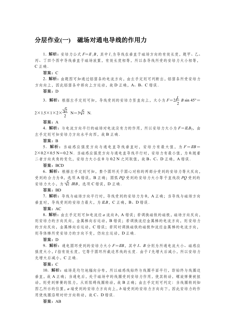 学生啦:分层作业(一)磁场对通电导线的作用力1.解析:安培力公式F=ⅡB,其中11为导线在垂直于磁场方向的有效长度,题甲、乙、丙、丁四个图中导线垂直于磁场放置,有效长度相等,所以各导线所受的安培力大小相等,答案:C2.解析:由题图可知通过铝箔条的电流方向,由左手定则可判断出,铝箔条所受安培力方向向上,因此铝箔条中部向上方运动,故D正确,A、B、C错误,答案:D3.解析:根据左手定则可知,导线受到的安培力竖直向上,大小为F=2上Bsin45°=2答案:A4.解析:与电流方向平行的磁场对电流没有力的作用,所以安培力大小为F=LB2,由左手定则可知安培力方向水平向西,故B正确,答案:B5.解析:当磁感应强度方向与通电直导线垂直时,安培力有最大值,为F=B=2×02×0.5N=02N.当磁感应强度方向与通电直导线平行时,安培力有最小值,为0.随着二者方向夹角的变化,安培力大小在0与02N之间取值,故B、C、D正确,A错误.答案:BCD6.解析:根据左手定则可知,整个圆环关于圆心对称的两部分受到的安培力等大反向,受到的合力为0,选项A错误,B正确;圆弧PQ受到的安培力大小等于直线段PQ受到的安培力大小,为V2RB,选项C错误,D正确.答案:BD7.解析:导线与磁场方向平行时,导线受到的安培力为0,A正确;当导线与磁场方向垂直时,导线受到的安培力最大,为LB,C正确,B、D错误答案:AC8.解析:由左手定则可知电流经流向b,A错误;若调换磁铁的磁极,磁场方向反向,则安培力的方向反向,金属棒向右运动,B错误;若调换流经金属棒的电流方向,则安培力的方向反向,金属棒向右运动,C错误;若同时调换磁铁的磁极和流经金属棒的电流方向,则导体棒所受安培力的方向不变,仍向左运动,D正确·答案:D9.解析:通电圆环受到的安培力大小F=B,其中I、B分别为所通电流大小、磁感应强度大小,1指有效长度,它等于圆环所截边界线的长度,由于1先增大后减小,所以安培力先增大后减小,C正确.答案:C10.解析:磁场是均匀地辐向分布,所以磁感线始终与线图平面平行,即始终与线圈边垂直,故A正确;当通电后,处于磁场中的线图受到安培力作用,使其转动,螺旋弹簧被扭动,则受到弹簧的阻力,从而阻碍线圈转动,故B正确;由左手定则可判定:当线圈转到如图乙所示的位置,端受到的安培力方向向上,b端受到的安培力方向向下,因此安培力的作用使线图沿顺时针方向转动,故C、D错误.答案:AB