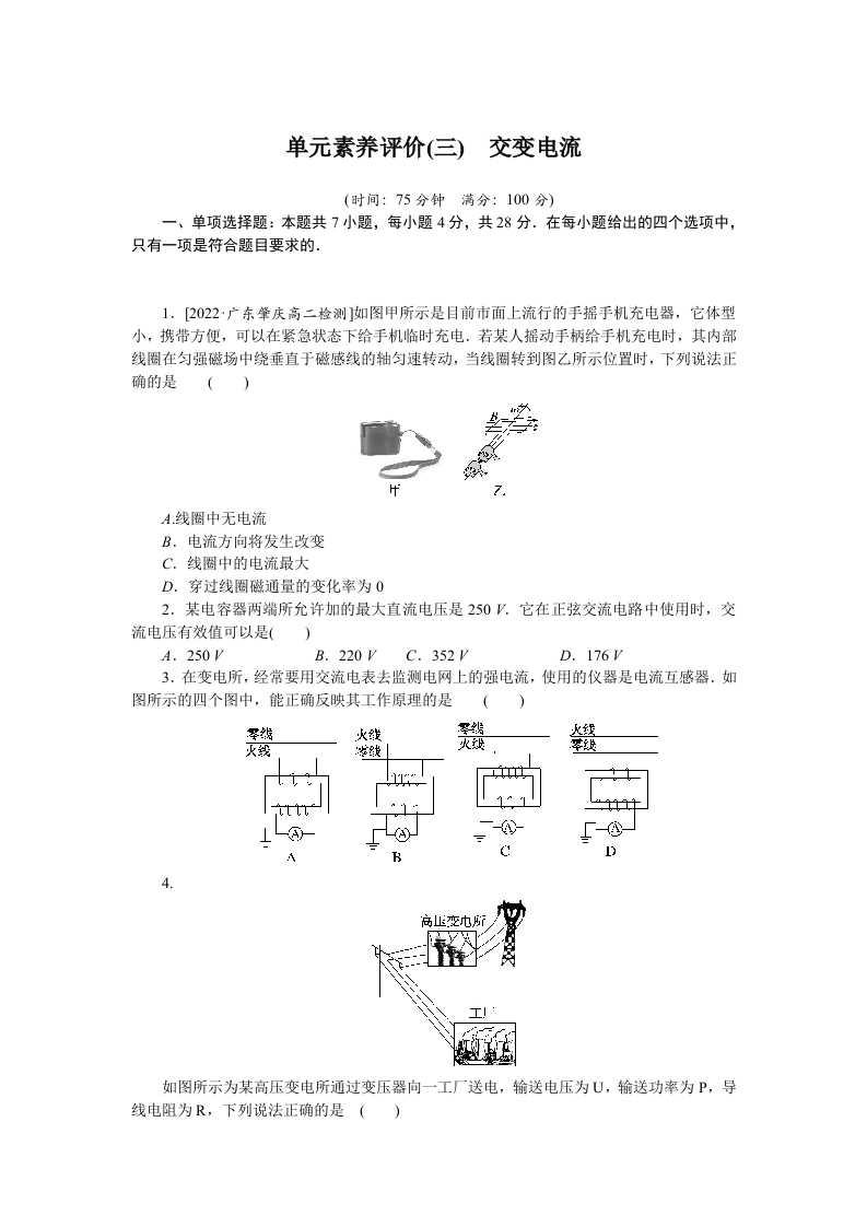 学生啦:单元素养评价(三)交变电流(时间:75分钟满分:100分)一、单项选择题:本题共7小题,每小题4分,共28分.在每小题给出的四个选项中,只有一项是符合题目要求的.1.[2022·广东肇庆高二检测]如图甲所示是目前市面上流行的手摇手机充电器,它体型小,携带方便,可以在紧急状态下给手机临时充电,若某人摇动手柄给手机充电时,其内部线圈在匀强磁场中绕垂直于磁感线的轴匀速转动,当线圈转到图乙所示位置时,下列说法正确的是()A线圈中无电流B.电流方向将发生改变C.线圈中的电流最大D.穿过线圈磁通量的变化率为02.某电容器两端所允许加的最大直流电压是250'.它在正弦交流电路中使用时,交流电压有效值可以是(A.250VB.220VC.352VD.176V3.在变电所,经常要用交流电表去监测电网上的强电流,使用的仪器是电流互感器.如图所示的四个图中,能正确反映其工作原理的是火蓝如图所示为某高压变电所通过变压器向一工厂送电,输送电压为U,输送功率为P,导线电阻为R,下列说法正确的是()