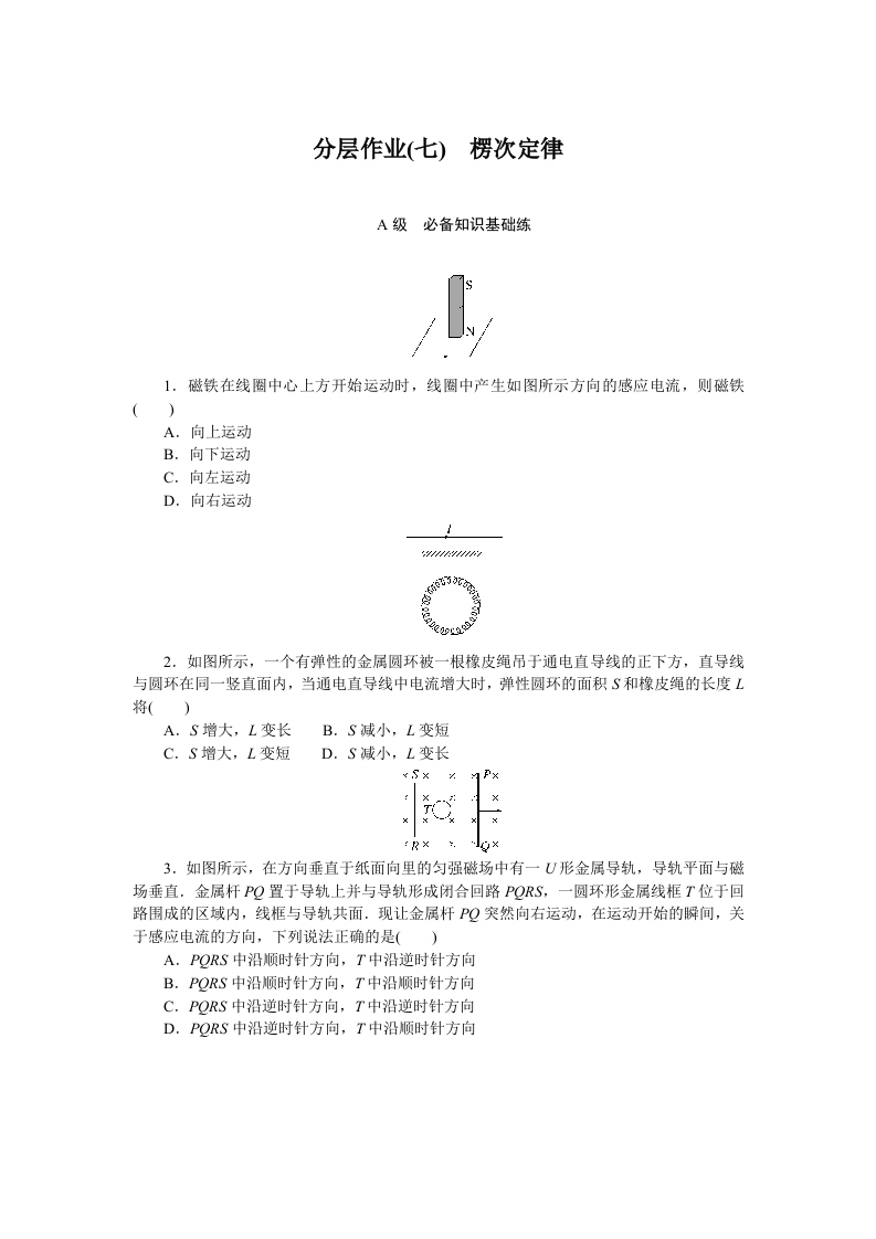 学生啦:分层作业(七)楞次定律A级必备知识基础练1.磁铁在线圈中心上方开始运动时,线圈中产生如图所示方向的感应电流,则磁铁A.向上运动B.向下运动C.向左运动D.向右运动2.如图所示,一个有弹性的金属圆环被一根橡皮绳吊于通电直导线的正下方,直导线与圆环在同一竖直面内,当通电直导线中电流增大时,弹性圆环的面积S和橡皮绳的长度LA.S增大,L变长B.S减小,L变短C.S增大,L变短D.S减小,L变长3.如图所示,在方向垂直于纸面向里的匀强磁场中有一U形金属导轨,导轨平面与磁场垂直.金属杆PQ置于导轨上并与导轨形成闭合回路PORS,一圆环形金属线框T位于回路围成的区域内,线框与导轨共面.现让金属杆PQ突然向右运动,在运动开始的瞬间,关于感应电流的方向,下列说法正确的是()A.PQRS中沿顺时针方向,T中沿逆时针方向B.PORS中沿顺时针方向,T中沿顺时针方向C.PORS中沿逆时针方向,T中沿逆时针方向D.PQRS中沿逆时针方向,T中沿顺时针方向