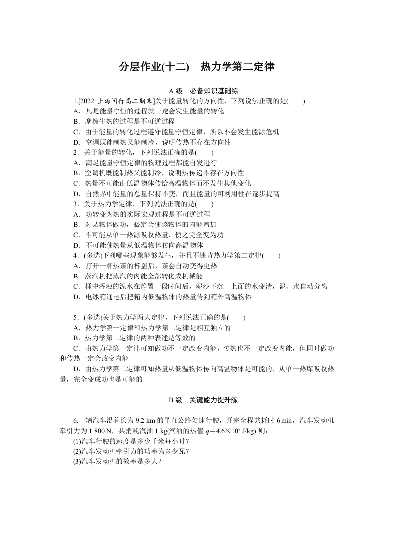 学生啦:分层作业(十二)热力学第二定律A级必备知识基础练1.[2022·上海闵行高二期末]关于能量转化的方向性,下列说法正确的是()A.凡是能量守恒的过程就一定会发生能量的转化B.摩擦生热的过程是不可逆过程C.由于能量的转化过程遵守能量守恒定律,所以不会发生能源危机D.空调既能制热又能制冷,说明传热不存在方向性2.关于能量的转化,下列说法正确的是()A.满足能量守恒定律的物理过程都能自发进行B.空调机既能制热又能制冷,说明热传递不存在方向性C.热量不可能由低温物体传给高温物体而不发生其他变化D.自然界中能量的总量保持不变,而且能量的可利用性在逐步提高3.关于热力学定律,下列说法正确的是()A.功转变为热的实际宏观过程是不可逆过程B.对某物体做功,必定会使该物体的内能增加C.不可能从单一热源吸收热量,使之完全变为功D.不可能使热量从低温物体传向高温物体4.(多选)下列哪些现象能够发生,并且不违背热力学第二定律()A.打开一杯热茶的杯盖后,茶会自动变得更热B.蒸汽机把蒸汽的内能全部转化成机械能C.桶中浑浊的泥水在静置一段时间后,泥沙下沉,上面的水变清,泥、水自动分离D.电冰箱通电后把箱内低温物体的热量传到箱外高温物体5.(多选)关于热力学两大定律,下列说法正确的是()A.热力学第一定律和热力学第二定律是相互独立的B.热力学第二定律的两种表述是等效的C.由热力学第一定律可知做功不一定改变内能,传热也不一定改变内能,但同时做功和传热一定会改变内能D.由热力学第二定律可知热量从低温物体传向高温物体是可能的,从单一热库吸收热量,完全变成功也是可能的B级关键能力提升练6.一辆汽车沿着长为9.2km的平直公路匀速行驶,开完全程共耗时6mn,汽车发动机牵引力为1800N,共消耗汽油1kg(汽油的热值g=4.6×10?Jkg).则:(1)汽车行驶的速度是多少千米每小时?(2)汽车发动机牵引力的功率为多少瓦?(3)汽车发动机的效率是多大?