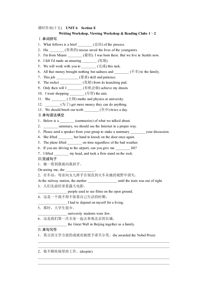 学生啦:课时作业(什五)UNT6 Section EWriting Workshop,Viewing Workshop Reading Clubs 1~21.What follows is a brief(总结)of the process.2.His(英勇的)rescue saved the lives of the youngsters.3.I'm from Miami(最初).I was bom there.But we live in Seattle now.4.I felt I'd made an amazing(发现)5.We will work with you to(完成)this task.6.All that money brought nothing but sadness and(不幸)to the family.7.This job(要求)skill and patience.8.The rocket(发射)from its launching pad.9.Only then will I(有机会做)achieve my dream.10.I went shopping(尽管)the rain.11.She(主修)maths and physics at university.12.(为了)get more money they can do anything.13.We should brush our teeth(至少)twice a day.Ⅱ单句语法填空1.Below is a(summarize)of what we talked about.summary,we should use the Internet in a proper way.3.Please send a speaker from your group to make a summaryyour discussion.4.She liftedher hand to knock on the door once again.5.The plane liftedon time regardless of the bad weather.6.If you are driving to the airport,can you give me7.I liftedmy head,and took a firm stand on the rock.1.她一看到我就向我招手。On seeing me,she2.在车站,母亲向女儿挥手告别直到火车从她的视野中消失。At the railway station,the motheruntil the train was out of sight.3.人们先前经常看露天电影。people used to see films on the open ground.4.这是一个我不得不依靠自己生活的时期。I had to depend on myself for a living.5.那时,大学生很少。university students were few.6.这是我们第一次全家一起去参观北京的长城。the Great Wall in Beijing together as a family.l.莫言因文学方面的成就而被授予诺贝尔奖。be awarded the Nobel Prize)2.他不顾疾病坚持工作。(despite)