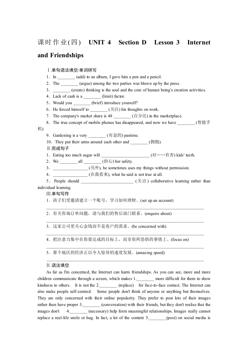 学生啦:课时作业(四)UNIT 4 Section DLesson 3 Internetand FriendshipsI单句语法填空/单词拼写(add)to an album,I gave him a pen and a pencil.2.The(argue)among the two parties was blown up by the press.3.(create)thinking is the soul and the core of human being's creation activities.4.Lack of cash is a(limit)factor.5.Would you(brief)introduce yourself?6.He forced himself to(关注)his thoughts on work.7.The company's market share is 48(百分比)in the marketplace.8.The true concept of mobile phones has disappeared,and now we have(智能手机)9.Gardening is a very(有益的)pastime.10.They put their arms around each other and(拥抱)Ⅱ完成句子1.Eating too much sugar will(对…有害)kids'teeth.2.Weall(担心)her safety.3(另外),he sometimes uses my things without permission.(在我看来),what he said is not true at all..5.People should(关注)collaborative leaming rather thanindividual leamingl.孩子们受邀请建立一个账号,学习如何理财。(set up an account)2.有关咨询订单问题,请与我们的售后部门联系。(enquire about)3.这家公司更关心金钱而不是客户的需求。(be concerned with)4.把注意力集中在你要达成的目标上,而非你所恐惧的事情上。(ocus on)5.那个地区的经济正以令人惊异的速度发展。(amazing speed)Ⅳ语法填空As far as I'm concemed,the Internet can harm friendships.As you can see,more and morechildren communicate through a screen,which makes 1.more difficult for them to showkindness to others.It is not the 2.(replace)for face-to-face contact.The Internet canalso make people self-centred.Some people don't think of anyone or anything but themselves.They are only concerned with their online popularity.They prefer to post lots of their imagesrather than have proper 3.(conversation)with their friends,but they don't realise that theimages don't 4.(necessary)help form meaningful relationships.Images really cannotreplace a real-life smile or hug.In fact,a lot of the content 5.(post)on social media is