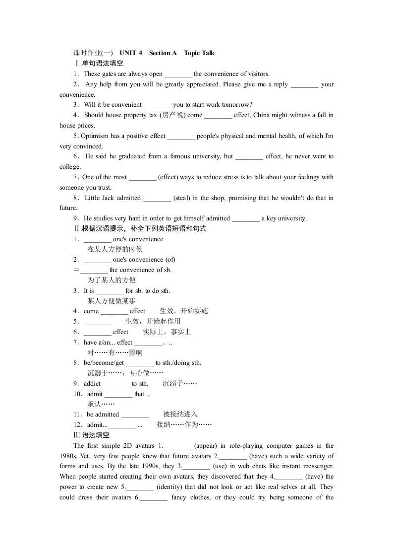 学生啦:课时作业(一)UNIT4 Section A Topic Talk【单句语法填空1.These gates are always openthe convenience of visitors.2.Any help from you will be greatly appreciated.Please give me a replyyourconvenience.3.Will it be convenientyou to start work tomorrow?4.Should house property tax(房产税)comeeffect,China might witness a fall in5.Optimism has a positive effectpeople's physical and mental health,of which I'mvery convinced.6.He said he graduated from a famous university,buteffect,he never went tocollege.7.One of the most(effect)ways to reduce stress is to talk about your feelings withsomeone you trust.8.Little Jack admitted(steal)in the shop,promising that he wouldn't do that infuture.9.He studies very hard in order to get himself admitteda key university.Ⅱ根据汉语提示,补全下列英语短语和句式one's convenience在某人方便的时候2.one's convenience (of)the convenience of sb.为了某人的方便3.It isfor sb.to do sth某人方便做某事4.comeeffect生效,开始实施5.生效,开始起作用effect实际上,事实上7.have a/an...effect对…有…影响8.be/become/getto sth./doing sth沉溺于…:专心做…9.addictto sth沉溺于…10.admit承认…11.be admitted被接纳进入12.admit...接纳…作为…The first simple 2D avatars 1.(appear)in role-playing computer games in the1980s.Yet,very few people knew that future avatars 2.(have)such a wide variety offorms and uses.By the late 1990s,they 3.(use)in web chats like instant messenger.When people started creating their own avatars,they discovered that they 4.(have)thepower to create new 5.(identity)that did not look or act like real selves at all.Theycould dress their avatars 6.fancy clothes,or they could try being someone of the