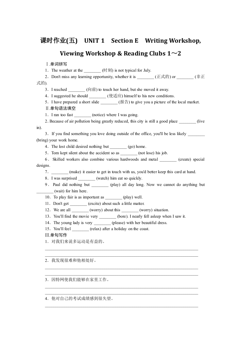 学生啦:课时作业(五)UNIT1 Section E Writing Workshop,Viewing Workshop Reading Clubs 1~2I单词拼写1.The weather at the(时刻)is not typical for July.2.Don't miss any learning opportunity,whether it is__(正式的)or(非正式的)3.I reached(向前)to touch her hand,.but she moved it away.4.I suggested he should(使适应)himself to his new conditions.5.I have prepared a short slide(报告)to give you a picture of the local market.Ⅱ.单句语法填空1.I ran too fast(notice)where I was going.2.Because of air pollution being greatly reduced,this city is still a good placein).3.If you find something you love doing outside of the office,you'll be less likely(bring)your work home.4.The lost child desired nothing but(go)home.5.Tom kept silent about the accident so as(not lose)his job.6.Skilled workers also combine various hardwoods and metal_(create)specialdesigns.7.(make)it easier to get in touch with us,you'd better keep this card at hand.8.I was surprised(watch)him eat so quickly.9.Paul did nothing but(play)all day long.Now we cannot do anything but(wait)for him here.10.To play fair is as important as11.Don't get(excite)about such a little matter.12.We are all(worry)about this(worry)situation.13.You'll find the movie very(bore).I nearly fell asleep when I saw it.14.The young lady is very(please)with her beautiful dress.15.You'll feel(relax)after a holiday on the coast.1.对我们来说多运动是有益的。2.我发现很难和他相处好。3.因特网使我们能够在家里工作。4.他对自己的考试成绩感到很失望。