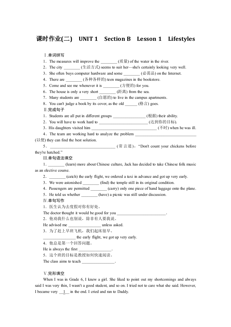 学生啦:课时作业(二)UNIT 1 Section B Lesson 1 Lifestyles1.The measures will improve the(质量)of the water in the river..2.The city(生话方式)seems to suit her--she's certainly looking very well.3.She often buys computer hardware and some(必需品)on the Internet..4.There are(各种各样的)teen magazines in the bookstore.5.Come and see me whenever it is(方便的)for you.6.The house is only a very short(距离)from the sea7.Many students are(自愿的)to live in the campus apartments.8.You can't judge a book by its cover,as the old(格言)goes.Ⅱ完成句子1.Students are all put in different groups(根据)their ability.2.You will have to work hard to(达到你的目标)3.His daughters visited him(不时)when he was ill.4.The team are working hard to analyze the problem(以便)they can find the best solution..5(常言道),“Don't count your chickens beforethey're hatched."Ⅲ单句语法填空1.(learn)more about Chinese culture,Jack has decided to take Chinese folk musicas an elective course.2.(catch)the early flight,we ordered a taxi in advance and got up very early.3.We were astonished(find)the temple still in its original condition.4.Passengers are permitted(carry)only one piece of hand luggage onto the plane5.He told us whether(have)a picnic was still under discussion.1.医生认为去度假对你有好处。The doctor thought it would be good for you2.他劝我什么也别说,除非有人要我说。He advised meunless asked.3.为了赶上早班飞机,我们起床很早。the early flight,we got up very early.4.他总是第一个回答问题。He is always the first5.这个班的目标是教授如何快速阅读。The class aims to teachV完形填空When I was in Grade 6,I knew a girl.She liked to point out my shortcomings and alwayssaid I was very thin,I wasn't a good student,and so on.I tried not to care what she said.However,I became very 1 in the end.I cried and ran to Daddy.