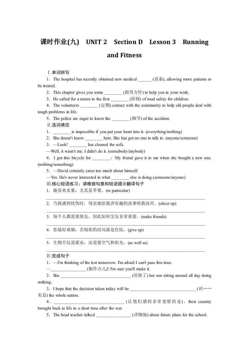 学生啦:课时作业(九)UNIT 2 Section D Lesson 3Runningand FitnessI.单词拼写1.The hospital has recently obtained new medical(设备),allowing more patients tobe treated.2.This chapter gives you some(指导方针)to help you in your work.3.He called for a return to the first(原则)of road safety for children.4.The volunteerscontact with the community to help old people deal withtough problems in life.5.The police are eager to know the(细节)of the accident..Ⅱ选词填空1.is impossible if you put your heart into it.(everything/nothing)2.She doesn't knowhere.She has got no one to talk to.(anyone/someone)has cleaned the sofa.-Well,it wasn't me.I didn't do it.(somebody/anybody)4.I got this bicycle for:My friend gave it to me when she bought a new one.(nothing/something)5.-David certainly cares too much about himself.-Yes.He's never interested in whatelse is doing.(someone/anyone)Ⅱ核心短语练习:请根据句意和短语提示翻译句子1.她喜欢水果,尤其是苹果。in particular)2.当我感到忧伤时,母亲就给我讲有趣的故事哄我高兴。(cheer up)3.每个人都需要朋友,因此如何交友非常重要。(make friends)4.你最好戒烟,否则你的结局就是住院。(give up)5.生物不仅需要水,还需要空气和阳光。(as well as)V完成句子1.-I'm thinking of the test tomorrow.I'm afraid I can't pass this time.(振作点儿)!I'm sure you'll make it.2.She(厌烦了)her son sitting around all day doingnothing.3.I hope that the decision taken today will be(对…有益)the whole nation.4.(让他们感到非常宽慰的是),their countrybrought back to life in a short time after the war.5.The head teacher talked(详细地)about future plans for the school..