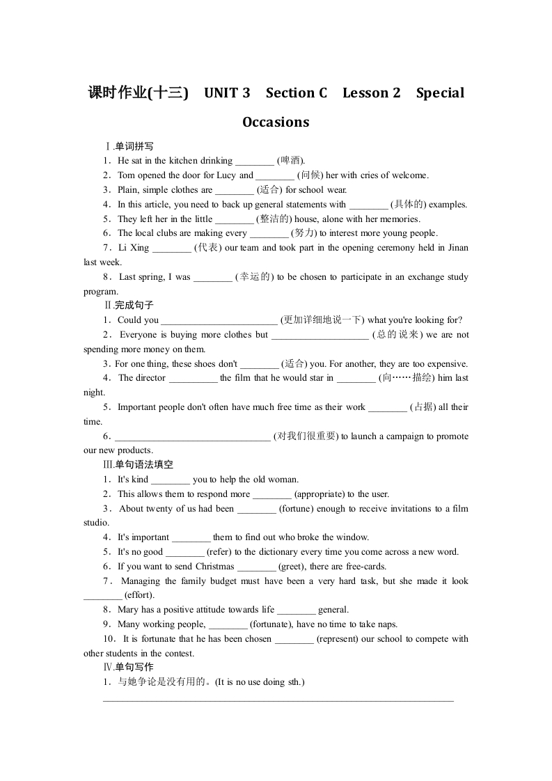 学生啦:课时作业(十三)UNIT 3 Section C Lesson 2SpecialOccasions1.He sat in the kitchen drinking(啤酒)2.Tom opened the door for Lucy and_(问候)her with cries of welcome.3.Plain,simple clothes are(适合)for school wear.4.In this article,you need to back up general statements with(具体的)examples.5.They left her in the little(整洁的)house,alone with her memories.6.The local clubs are making every(努力)to interest more young people.7.Li Xing(our team and took part in the opening ceremony held in Jinanlast week.8.Last spring,I was(幸运的)to be chosen to participate in an exchange studyprogram.Ⅱ完成句子1.Could you(更加详细地说一下)what you're looking for?2.Everyone is buying more clothes but(总的说来)we are notspending more money on them.3.For one thing,these shoes don't(适合)you.For another,,they are too expensive.4.The directorthe film that he would star in_(向…描绘)him lastnight.5.Important people don't often have much free time as their work(占据)all theirtime.(对我们很重要)to launch a campaign to promoteour new products.单句语法填空1.It's kindyou to help the old woman2.This allows them to respond more(appropriate)to the user.3.About twenty of us had been(fortune)enough to receive invitations to a filmstudio.4.It's importantthem to find out who broke the window.5.It's no good(refer)to the dictionary every time you come across a new word.6.If you want to send Christmas(greet),there are free-cards.7.Managing the family budget must have been a very hard task,but she made it look(effort).8.Mary has a positive attitude towards lifegeneral.9.Many working people,(fortunate),have no time to take naps.10.It is fortunate that he has been chosen(represent)our school to compete withother students in the contest.1.与她争论是没有用的。It is no use doing sth.)