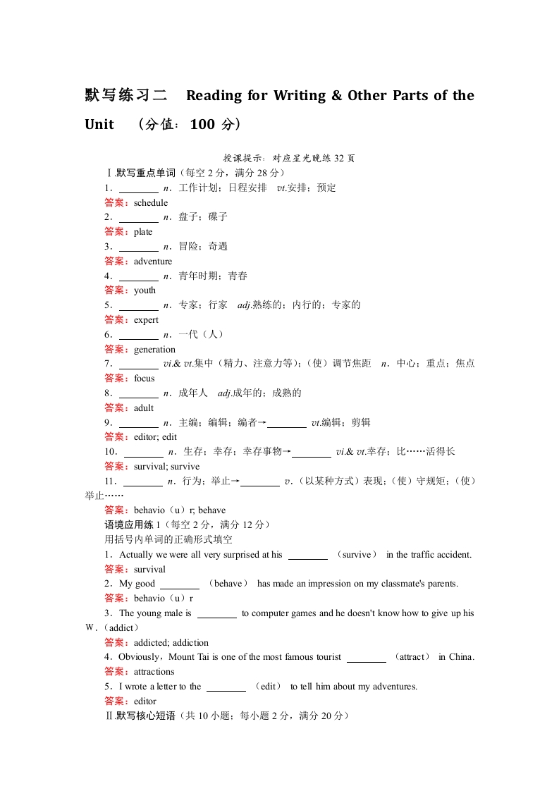 学生啦:默写练习二Reading for Writing Other Parts of theUnit(分值:100分)授课提示:对应星光晚练32页I默写重点单词(每空2分,满分28分)1.n.工作计划:日程安排t.安排:预定答案:schedule答案:plate3.n.冒险:奇遇答案:adventuren.青年时期:青春答案:youhn.专家:行家a山熟练的:内行的:专家的答案:expert6.n.一代(人)答案:generation7.i.&t集中(精力、注意力等):(使)调节焦距n.中心:重点:焦点答案:focusn.成年人ad.成年的:成熟的答案:adult9.n.主编:编辑:编者→答案:editor;edit10.i.&t幸存:比…活得长答案:survival;:survive11..行为:举止→.(以某种方式)表现:(使)守规矩:(使)举止…答案:behavio(u)r,behave语境应用练1(每空2分,满分12分)用括号内单词的正确形式填空1.Actually we were all very surprised at hissurvive in the traffic accident.答案:survival2.My good(behave has made an impression on my classmate's parents.答案:behavio(u)r3.The young male isto computer games and he doesn't know how to give up hisW.(addict)答案:addicted;addiction4.Obviously,Mount Tai is one of the most famous tourist(attract)in China答案:attractions5.I wrote a letter to the(edit)to tell him about my adventures答案:editorⅡ默写核心短语(共10小题:每小题2分,满分20分)