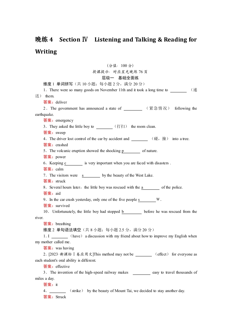 学生啦:晚练4 Section IVListening and Talking Reading forWriting(分值:100分)授课提示:对应星光晚练76页层级一基础全面练维度1单词拼写(共10小题:每小题2分,满分20分)1.There were so many goods on November 11th and it took a long time to(递送)hem答案:deliver2.The govemment has announced a state of(紧急情况)following theearthquake.答案:emergency3.They asked the little boy to(打扫)the room clean..答案:sweep4.The driver lost control of the car by accident and(碰,撞)into a tree..答案:crashed5.The volcanic eruption showed the shocking pof nature答案:power6.Keeping cis very important when you are faced with disasters.答案:calm7.The visitors were sby the beauty of the West Lake.答案:struck8.Several hours later,the little boy was rescued with the aof the police.答案:aid9.In the car crash yesterday,only one of the five people s W.答案:survived10.Unfortunately,the little boy had stopped bbefore he was rescued from the答案:breathing维度2单句语法填空(共8小题:每小题2.5分,满分20分)(have)a discussion with my friend about how to improve my English whenmy mother called me.答案:was having(effect)for everyone aseach student's oral ability is different.答案:effective3.The invention of the high-speed railway makeseasy to travel thousands ofmiles a day.4.strike by the beauty of Mount Tai,we decided to stay another day.答案:Struck