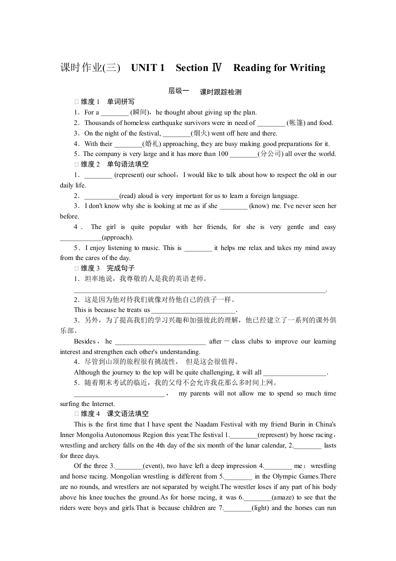 学生啦:课时作业(三)UNIT 1 Section IVReading for Writing层级一课时跟踪检测口维度1单词拼写1.For a(瞬间),he thought about giving up the plan.2.Thousands of homeless earthquake survivors were in need of(帐篷)and food.3.On the night of the festival,(烟火)went off here and there.4.With their(approaching,they are busy making good preparations for it.5.The company is very large and it has more than 100()all over the world.口维度2单句语法填空(represent)our school,I would like to talk about how to respect the old in ourdaily life.2.(read)aloud is very important for us to leam a foreign language.3.I don't know why she is looking at me as if she(know)me.I've never seen herbefore.4.The girl is quite popular with her friends,for she is very gentle and easy(approach).5.I enjoy listening to music.This isit helps me relax and takes my mind awayfrom the cares of the day.口维度3完成句子1.坦率地说,我尊敬的人是我的英语老师。2.这是因为他对待我们就像对待他自己的孩子一样。This is because he treats us3.另外,为了提高我们的学习兴趣和加强彼此的理解,他己经建立了一系列的课外俱乐部。Besides,heafter -class clubs to improve our leaminginterest and strengthen each other's understanding.4.尽管到山顶的旅程很有挑战性,但是这会很值得。Although the journey to the top will be quite challenging,it will all5.随着期末考试的临近,我的父母不会允许我花那么多时间上网。my parents will not allow me to spend so much timesurfing the Internet.口维度4课文语法填空This is the first time that I have spent the Naadam Festival with my friend Burin in China'sInner Mongolia Autonomous Region this year.The festival 1.(represent)by horse racing,wrestling and archery falls on the 4th day of the six month of the lunar calendar,2.lastsfor three days.Of the three 3.(event),two have left a deep impression 4.me:wrestlingand horse racing.Mongolian wrestling is different from 5.in the Olympic Games.Thereare no rounds,and wrestlers are not separated by weight.The wrestler loses if any part of his bodyabove his knee touches the ground.As for horse racing,it was 6.(amaze)to see that theriders were boys and girls.That is because children are 7.(light)and the horses can run
