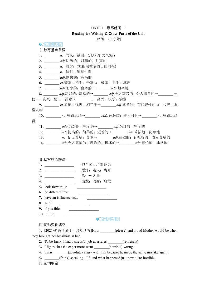 学生啦:UNIT1默写练习ニReading for Writing Other Parts of the Unit[时间:20分钟]®词汇默写I默写重点单词1.n.气氛:氛围:(地球的)大气(层)2.ad.阴历的:月球的:月亮的.前夕:(尤指宗教节假日的前夜)4.n.信封:塑料封套5.ad.愉快的:高兴的6.7.a山.坦率的:直率的→a.坦率地a山.高兴的:满意的→ad.令人高兴的:令人满意的→使…高兴:使…满意→n.高兴:快乐:满意9.a山.典型的:有代表性的n.代表:典型人物10.n.摔跤运动员11.ad.绝对地:完全地→12.a.简洁的:简单的:短暂的→ad.简洁地:简单地13.ad恭敬的:有礼貌的:表示尊敬的14.a山.令人震惊的:恐怖的:极坏的→ad.可怕地:非常地Ⅱ默写核心短语1坦白说:坦率地说2.3.除…之外4.出发:动身:启程5.look forward tobe different from7.have an influence on...8.as if9.if possible10.fill in⑧语境运用1.[2021新高考卷I,读后续写]How(please)and proud Mother would be whenthey brought her breakfast in bed.2.To be frank,I had a stressful job as a sales(represent)3.I figure that the experiment went4.I was(absolute)angry with him because he made the same mistake again.5.(frank)speaking,I found what happened just now quite horrible.V选词填空